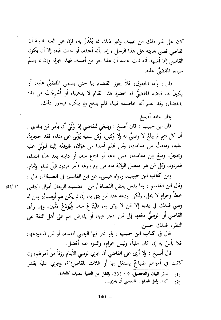 ومن كتاب ابن حبيب، ورواه عيسى، عن ابن القاسم، في العتبية، قال: وقال ابن القاسم: وما يفعل بعض القضاة/ من تضمينه الرجال أموال اليتامى خطأ وحرام لا يحل، ولكن يودعه عند من يثق به، إن لم يكن لهم أوصياء، ومن له وصي فذلك في يديه إلا من لا يوثق به، فلينزع منه، وليودع لأمين، وإن رأي القاضي أو الوصي دفعها إلى من يتجر فيها، أو يقارض لهم على أهل الثقة على النظر، فذلك حسن.