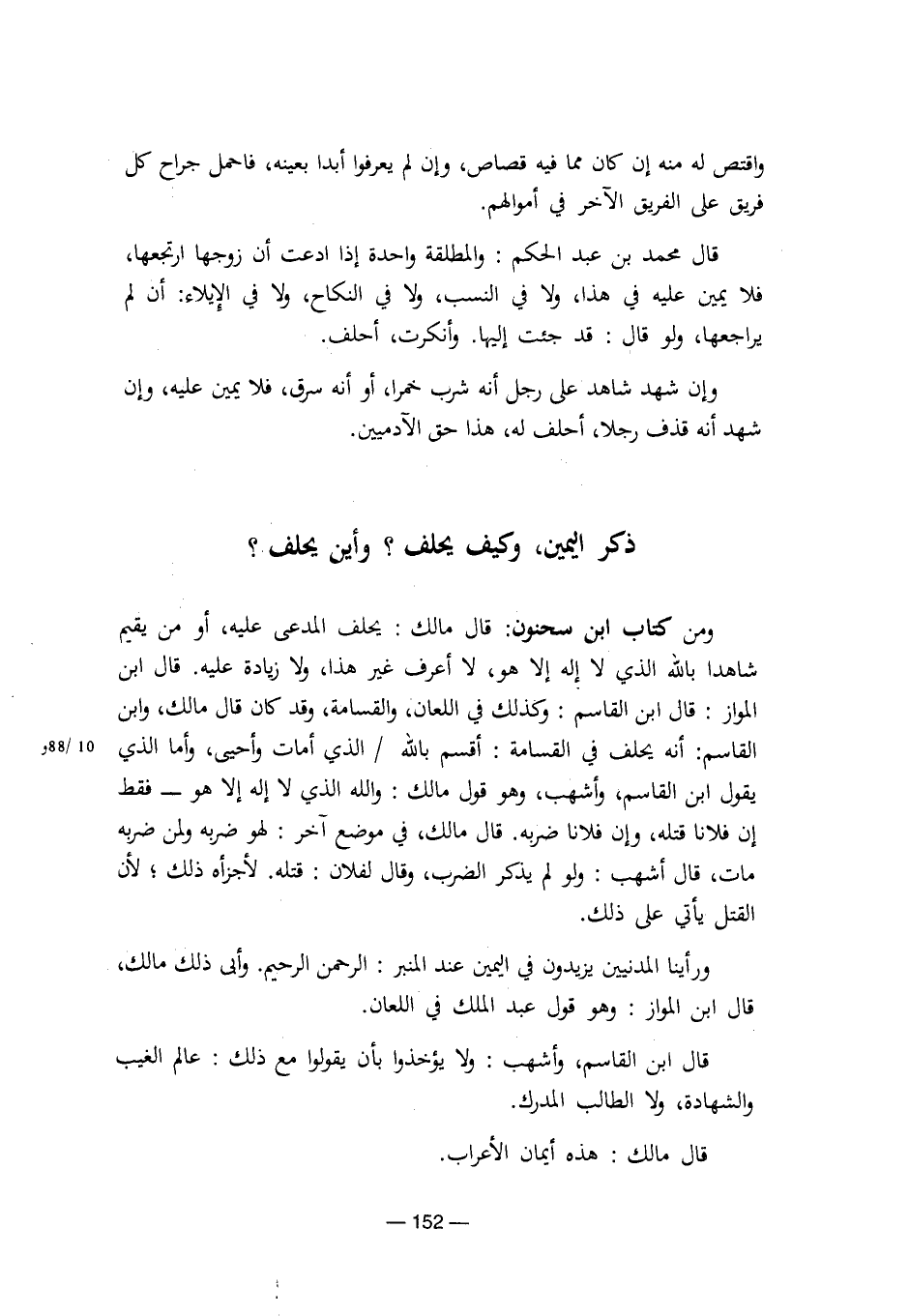 ومن كتاب ابن سحنون: قال مالك: يحلف المدعي عليه، أو من يقيم شاهدا بالله الذي لا إله إلا هو، لا أعرف غير هذا، ولا زيادة عليه قال ابن المواز: قال ابن القاسم: وكذلك في اللعان، والقسامة، وقد كان قال مالك، وابن القاسم: أنه يحلف في القسامة: اقسم بالله/ الذي أمات وأحيي، وأما الذي يقول ابن القاسم، وأشهب، وهو قول مالك: والله الذي لا إله إلا هو- فقط إن فلانا قتله، وإن فلانا ضربه. قال مالك، في موضع آخر: لهو ضربه ولمن ضربه مات، قال أشهب: ولو لم يذكر الضرب، وقال لفلان: قتله. لأجزأه ذلك، لأن القتل يأتي على ذلك. ورأينا المدنيين يزيدون في اليمين عند المنبر: الرحمن الرحيم. وأبى ذلك مالك، قال ابن المواز: وهو قول عبد الملك في اللعان.