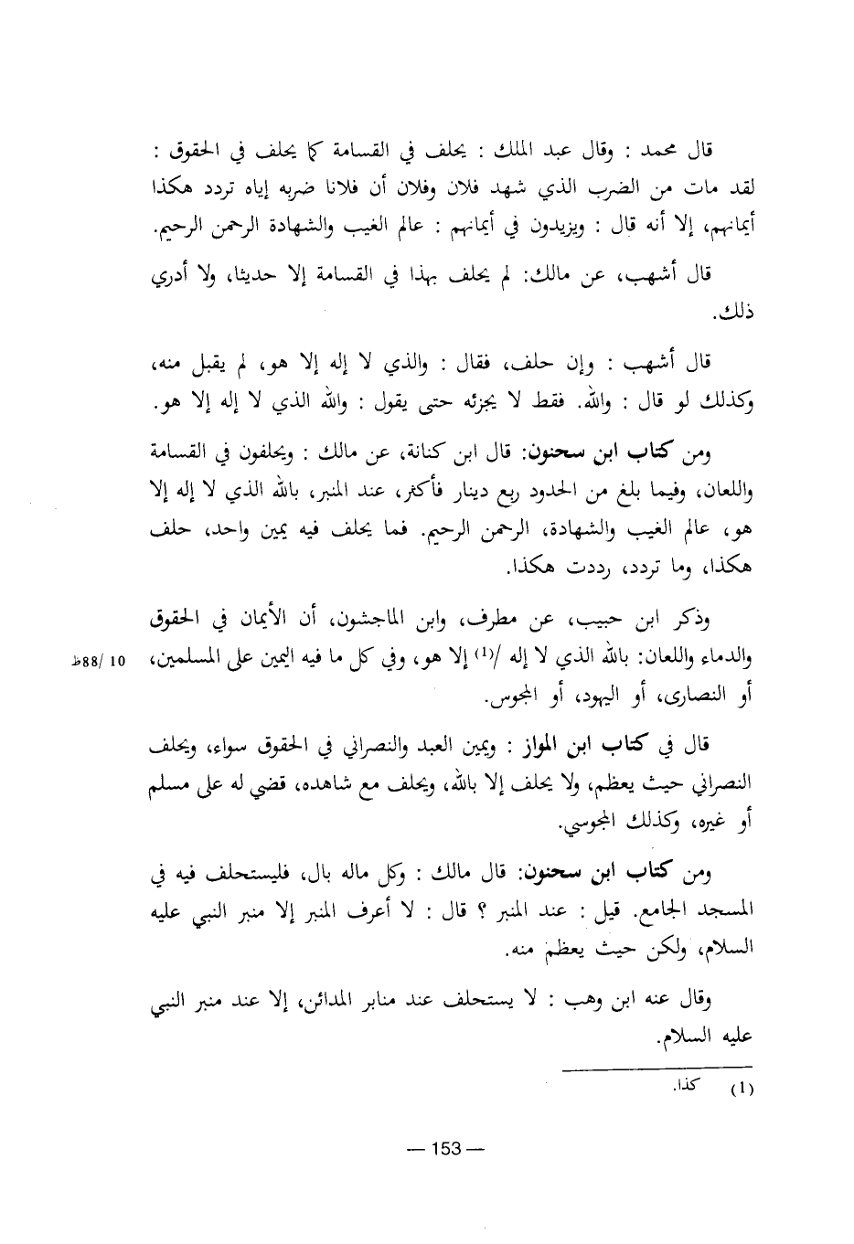 ومن كتاب ابن سحنون: قال ابن كنانة، عن مالك: ويحلفون في القسامة واللعان، وفيما بلغ من الحدود ربع دينار فأكثر، عند المنبر، بالله الذي لا إله إلا هو، عالم الغيب والشهادة، الرحمن الرحيم. فيما يحلف فيه يمين واحد، حلف هكذا، وما تردد، رددت هكذا.