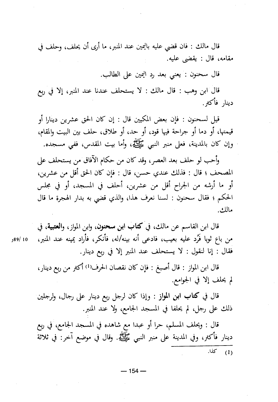 وأحب لو حلف بعد العصر، وقد كان من حكام الآفاق من يستحلف على المصحف؛ قال: فذلك عندي حسن، قال: فان كان الحق أقل من عشرين، أو ما أرشه من الجراح اقل من عشرين، أحلف في المسجد، أو في مجلس الحكم؛ فقال سحنون: لسنا نعرف هذا، والذي قضي به بدار الهجرة ما قال مالك.
