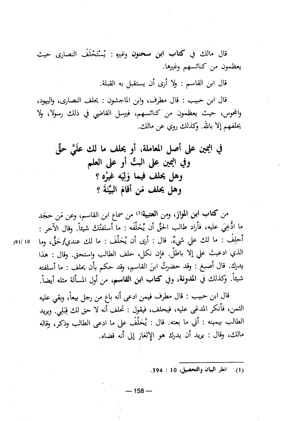 من كتاب ابن المواز، ومن العتبية من سماع ابن القاسم، وعن من حجد ما ادعي عليه، فأراد طالب الحق أن يحلفه: ما أسلفتك شيئا. وقال الآخر: أحلف: ما لك على شيء. قال أرى أن يحلف: ما لك عندي/ حق، وما الذي ادعيت علي إلا باطل. فإن نكل، حلف الطالب استحق. وقال: هذا يدرك. قال أصبغ: وقد حضرت ابن القاسم، وقد حكم بأن يحلف: ما أسلفته شيئا. وكذلك في المدونة، وفي كتاب ابن القاسم، من أول المسألة مثله أيضا.