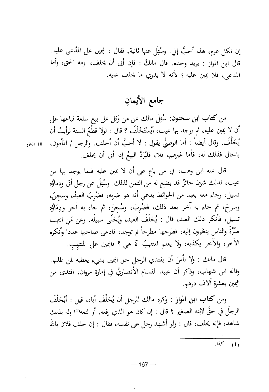 قال عنه ابن وهب، في من باع على أن لا يمين عليه فيما يوجد بها من عيب، فذلك شرط جائز قد يضع له من الثمن لذلك. وسئل عن رجل أتى ودماؤه تسيل، وجاء معه بعبد من الحوائط يدعي أنه هو ضربه، فضرب العبد، وسجن، وسرح، ثم جاء به آخر بعد ذلك، فضرب، وسجن، ثم جاء به آخر ودماؤه تسيل، فأنكر ذلك العبد، قال: يحلف العبد، ويخلي سبيله. وعن من انتهب صرة والناس ينظرون إليه، فطرحها مطرحا لم توجد، فادعى صاحبها عددا وأنكره الآخر، والآخر يكذبه، ولا يعلم المنتهب كم هي؟ فاليمين على المنتهب.