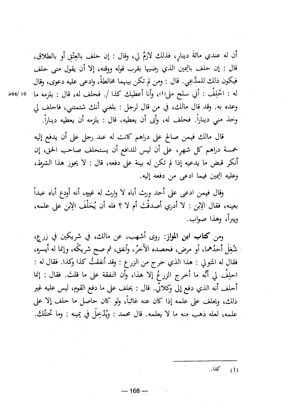 أن له عندي مائة دينار، فذلك لازم لي، وقال: إن حلف بالعتق أو بالطلاق، قال: إن حلف باليمين الذي رضيها بقرب قوله ووقته، إلا أن يقول متى حلف فيكون ذلك للمدعي. قال: ومن لم تكن بينهما مخالطة، وادعى عليه دعوى، وقال له: احلف: أني سلح ملي، وأنا أعطيك كذا/. فحلف له، قال: يلزمه ما وعده به. وقد قال مالك، في من قال لرجل: بلغني أنك شتمتني، فاحلف لي وخذ مني دينارا. فحلف له، وأبى أن يعطيه، قال: يلزمه أن يعطيه دينارا.
