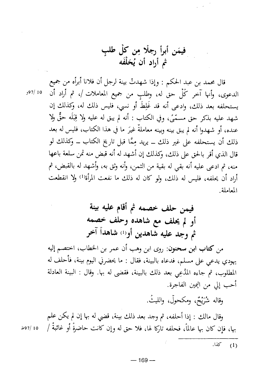 من كتاب ابن سحنون: روى ابن وهب أن عمر بن الخطاب، اختصم إليه يهودي يدعي على مسلم، فدعاه بالبينة، فقال: ما يحضرني اليوم بينة، فأحلف له المطلوب، ثم جاءه المدعي بعد ذلك بالبينة، فقضى له بها. وقال: البينة العادلة أحب إلي من اليمين الفاجرة.