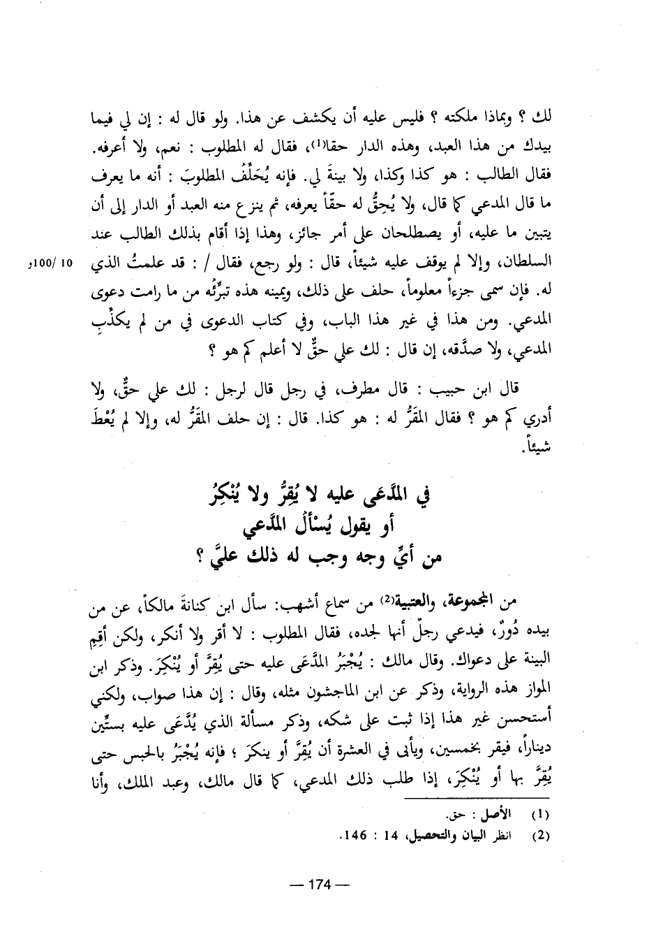 من المجموعة، والعتبية من سماع أشهب: سأل ابن كنانة مالكا، عن من بيده دور، فيدعي رجل أنها لجده، فقال المطلوب: لا أقر ولا أنكر، ولكن أقم البينة على دعواك. وقال مالك: يجبر المدعي عليه حتى يقر أو ينكر. وذكر ابن المواز هذه الرواية، وذكر عن ابن الماجشون مثله، وقال: إن هذا صواب، ولكني استحسن غير هذا إذا ثبت على شكه، وذكر مسألة الذي يدعي عليه بستين دينارا، فيقر بخمسين، ويأبى في العشرة أن يقر أو ينكر، فإنه يجبر بالحبس حتى يقر بها أو ينكر، إذا طلب ذلك المدعي، كما قال مالك، وعبد الملك، وأنا [8/ 174]