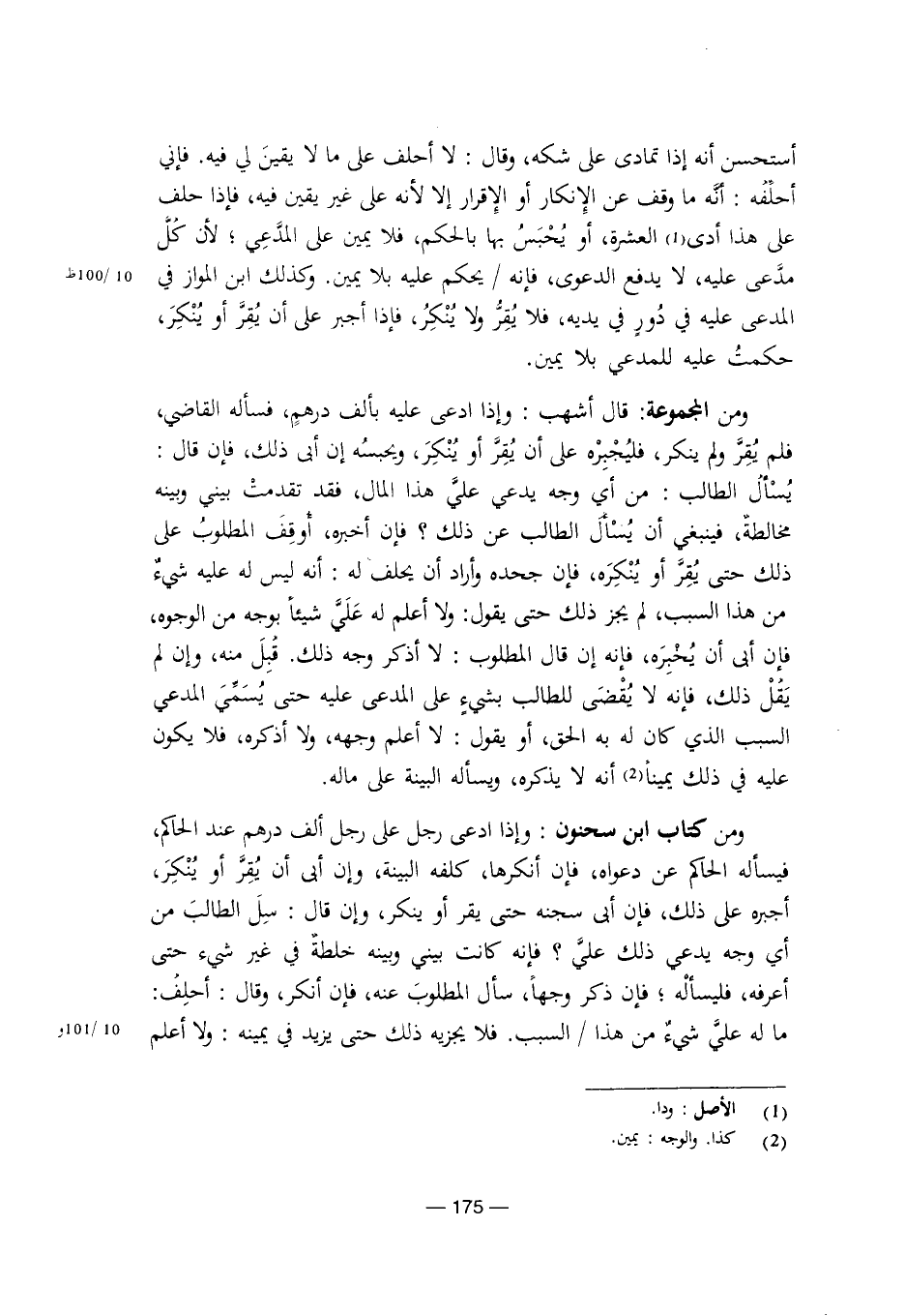 أستحسن أنه إذا تمادى على شكه، وقال: لا أحلف على ما لا يقين لي فيه. فإني أحلفه: أنه ما وقف عن الإنكار أو الإقرار إلا لأنه على غير يقين فيه، فإذا حلف على هذا أدى العشرة، أو يحبس بها بالحكم، فلا يمين على المدعي؛ لأن كل مدعي عليه، لا يدفع الدعوى، فإنه/ يحكم عليه بلا يمين. وكذلك ابن المواز في المدعى عليه في دور في يديه، فلا يقر ولا ينكر، فإذا أجبر على أن يقر أو ينكر، حكمت عليه للمدعي بلا يمين.