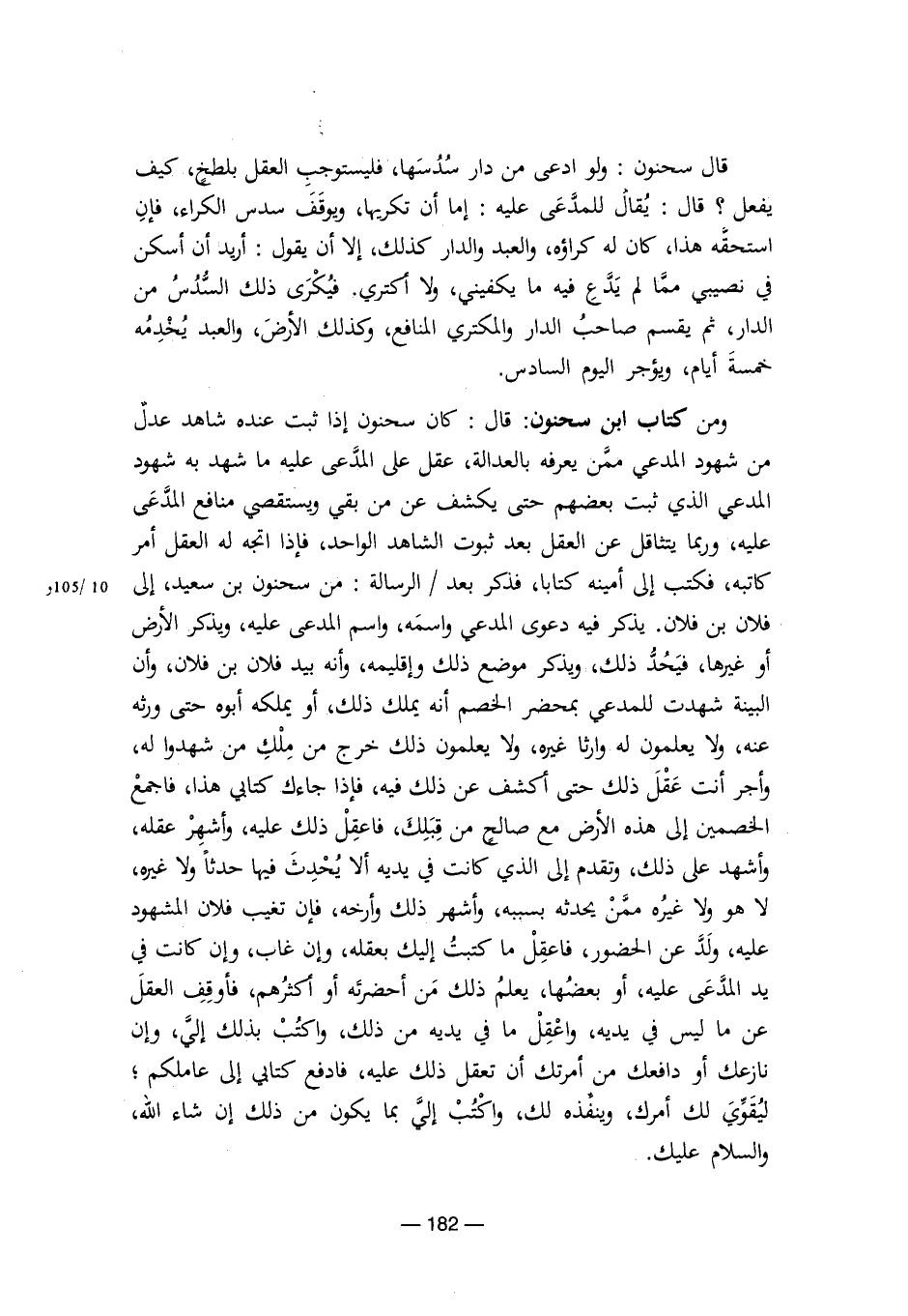 ومن كتاب ابن سحنون: قال: كان سحنون إذا ثبت عنده شاهد عدل من شهود المدعي ممن يعرفه بالعدالة، عقل على المدعي عليه ما شهد به شهود المدعي الذي ثبت بعضهم حتى يكشف عن من بقي ويستقصي منافع المدعي عليه، وربما يتثاقل عن العقل بعد ثبوت الشاهد الواحد، فإذا اتجه له العقل أمر كاتبه، فكتب إلى أمينه كتابا، فذكر بعد/ الرسالة: من سحنون بن سعيد، إلى فلان بن فلان. يذكر فيه دعوى المدعي واسمه، واسم المدعى عليه، ويذكر الأرض أو غيرها، فيحد ذلك، ويذكر موضع ذلك وإقليمه، وأنه بيد فلان بن فلان، وأن البينة شهدت للمدعي بمحضر الخصم أنه يملك ذلك، أو يملكه أبو حتى ورثه عنه، ولا يعلمون له وارثا غيره، ولا يعلمون ذلك خرج من ملك من شهدوا له، وأجر أنت عقل ذلك حتى أكشف عن ذلك فيه، فإذا جاءك كتابي هذا، فاجمع الخصمين إلى هذه الأرض مع صالح من قبلك، فاعقل ذلك عليه، وأشهر عقله، وأشهد على ذلك، وتقدم إلى الذي كانت في يديه ألا يحدث فيها حدثا ولا غيره، لا هو ولا غيره ممن يحدث بسببه، وأشهر ذلك وأرخه، فإن تغيب فلان المشهود عليه، ولد عن الحضور، فاعقل ما كتبت إليك بعقله، وإن غاب، وإن كانت في يد المدعى عليه، أو بعضها، يعلم ذلك من أحضرته أو أكثرهم، فأوقف العقل عن ما ليس في يديه، واعقل ما في يديه من ذلك، واكتب بذلك إلي، وإن نازعك أو دافعك من أمرتك أن تعقل ذلك عليه، فادفع كتابي بذلك إلي، وإن نازعك أو دافعك من أمرتك أن تعقل ذلك عليه، فادفع كتابي إلى عاملكم؛ ليقوي لك أمرك، وينفذه لك، واكتب إلي بما يكون من ذلك إن شاء الله، والسلام عليك. [8/ 182]
