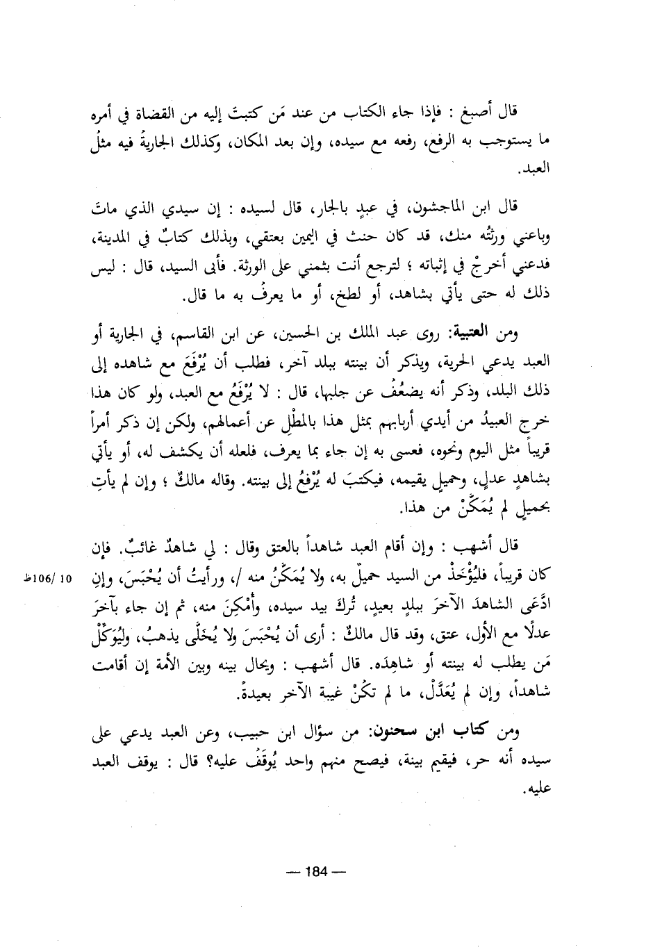 ومن كتاب ابن سحنون: من سؤال ابن حبيب، وعن العبد يدعي على سيده أنه حر، فيقيم بينة، فيصح منهم واحد يوقف عليه؟ قال: يوقف العبد عليه. [8/ 184]