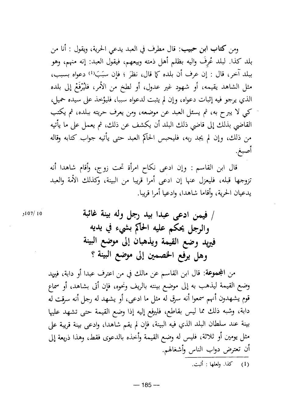 ومن كتاب ابن حبيب: قال مطرف في العبد يدعي الحرية، ويقول: أنا من بلد كذا. لبلد عرف واليه بظلم أهل ذمته وبيعهم، فيقول العبد: إنه منهم، وهو ببلد آخر، قال: إن عرف أن بلده كما قال، نظر؛ فإن سبب دعواه بسبب، مثل الشاهد يقيمه، أو شهود غير عدول، أو لطخ من الأمر، فليرفع إلى بلده الذي يرجو فيه اثبات دعواه، وإن لم يثبت لدعواه سببا، فليؤخذ على سيده حميل، كي لا يبرح به، ثم يسئل العبد عن موضعه، ومن يعرف حريته ببلده، ثم يكتب القاضي بذلك إلى قاضي ذلك البلد أن يكشف عن ذلك، ثم يعمل على ما يأتيه من ذلك، وإن لم يجد ربه، فليحبس الحاكم العبد حتى يأتيه جواب كتابه وقاله أصبغ.