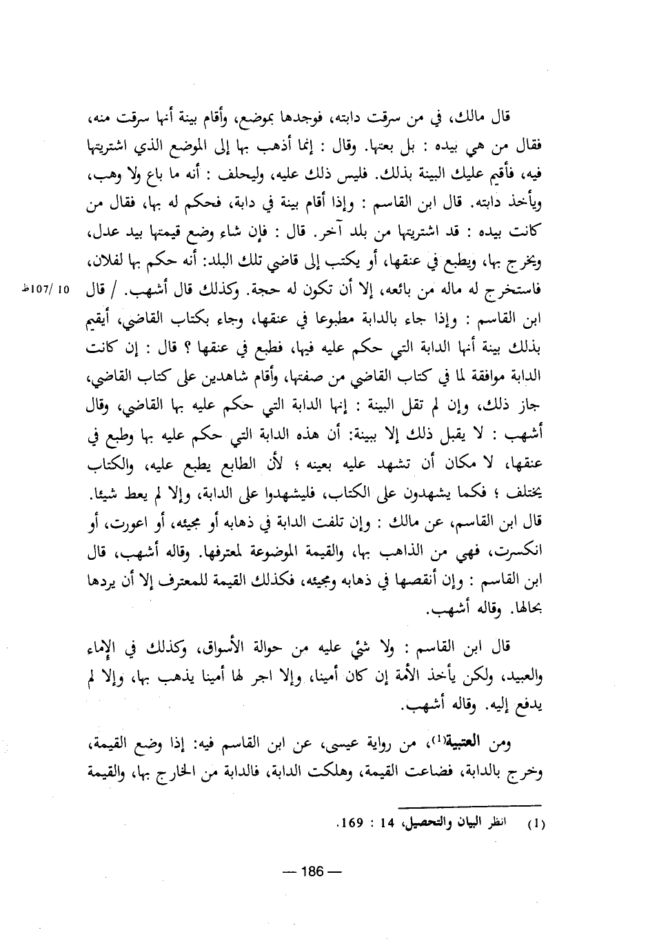 قال مالك، في من سرقت دابته، فوجدها بموضع، وأقام بينة أنها سرقت منه، فقال، من هي بيده: بل بعتها. وقال: إنما أذهب بها إلى الموضع الذي اشتريتها فيه، فأقيم عليك البينة بذلك. فليس ذلك عليه، وليحلف: أنه ما باع ولا وهب، ويأخذ دابته. قال ابن القاسم: وإذا أقام بينة في دابة، فحكم له بها، فقال من كانت بيده: قد اشترتيها من بلد آخر. قال: فإن شاء وضع قيمتها بيد عدل، ويخرج بها، ويطبع في عنقها، أو يكتب إلى قاضي تلك البلد: أنه حكم بها لفلان، فاستخرج له ما له من بائعه، إلا أن تكون له حجة. وكذلك قال أشهب./ قال ابن القاسم: وإذا جاء بالدابة مطبوعا في عنقها، وجاء بكتاب القاضي، أيقيم بذلك بينة أنها الداية التي حكم عليه فيها، فطبع في عنقها؟ قال: إن كانت الدابة موافقة لما في كتاب القاضي من صفتها، وأقام شاهدين على كتاب القاضي، جاز ذلك، وإن لم تقل البينة: إنها الدابةالتي حكم عليه بها القاضي، وقال أشهب: لا يقبل ذلك إلا ببينة: أن هذه الدابة التي حكم عليه وطبع في عنقها، لا مكان أن تشهد عليه بعينه؛ لأن الطابع يطبع عليه، والكتاب يختلف؛ فكما يشهدون على الكتاب، فليشهدوا على الدابة، وإلا لم يعط شيئا. قال ابن القاسم، عن مالك: وإن تلفت الدابة في ذهابه أو مجيئه، أو اعورت، أو انكسرت، فهي من الذاهب بها، والقيمة الموضوعة لمعترفها، وقاله أشهب، قال ابن القاسم: وإن انقصها في ذهابه ومجئيه، فكذلك القيمة للمعترف إلا أن يردها بحالها. وقاله أشهب.