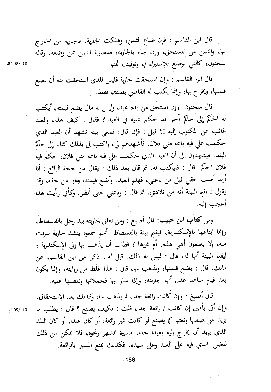 قال سحنون: وإن استحق من يده عبد، وليس له مال يضع قيمته، أيكتب له الحاكم إلى حاكم آخر قد حكم عليه في العبد؟ فقال: كيف هذا، والعبد غائب عن المكتوب إليه!؟ قيل: فإن قال: فمعي بينة تشهد أن العبد الذي حكمت علي فيه باعه مني فلان. فأشهدهم لي، واكتب لي بذلك كتابا إلى حاكم البلد، فيشهدون إلى أن العبد الذي حكمت علي فيه باعه مني فلان، فحكم فيه فلان الحاكم. قال: فليكتب له، ثم قال بعد ذلك: يقال من حجة البائع: أنا أريد أطلب حقي قبل من باعني، فهلم العبد، وأضع قيمته، وهو من حقه، وقد يقول: أقيم البينة أنه من تلادي. ثم قال: ودعني حتى أنظر. وكأني رأيت هذا أعجب إليه.