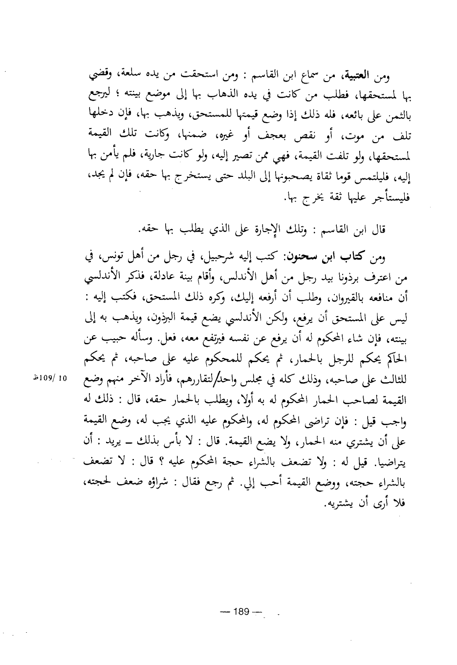 ومن كتاب ابن سحنون: كتب إليه شرحبيل، في رجل من أهل تونس، في من اعترف برذونا بيد رجل من أهل الأندلس، وأقام بينة عادلة، فذكر الأندلسي أن منافعه بالقيروان، وطلب أن أرفعه إليك، وكره ذلك المستحق، فكتب إليه: ليس على المستحق أن يرفع، ولكن الأندلسي يضع قيمة البرذون، ويذهب به إلى بينته، فإن شاء المحكوم له أن يرفع عن نفسه فيرتفع معه، فعل وسأله حبيب عن الحاكم يحكم للرجل بالحمار، ثم يحكم للمحكوم عليه على صاحبه، ثم يحكم للثالث على صاحبه، وذلك كله في مجلس واحد/ لتقاررهم، فأراد الآخر منهم وضع القيمة لصاحب الحمار المحكوم له به أولا، ويطلب بالحمار حقه: قال: ذلك له واجب قيل: فإن تراضى المحكوم له، والمحكوم عليه الذي يجب له، وضع القيمة على أن يشتري منه الحمار، ولا يضع القيمة. قال: لا بأس بذلك- يريد: أن يتراضيا. قيل له: ولا تضعف بالشراء حجة المحكوم عليه؟ قال: لا تضعف بالشراء حجته، ووضع القيمة أحب إلي. ثم رجع فقال: شراؤه ضعف لحجته، فلا أرى أن يشتريه. [8/ 189]