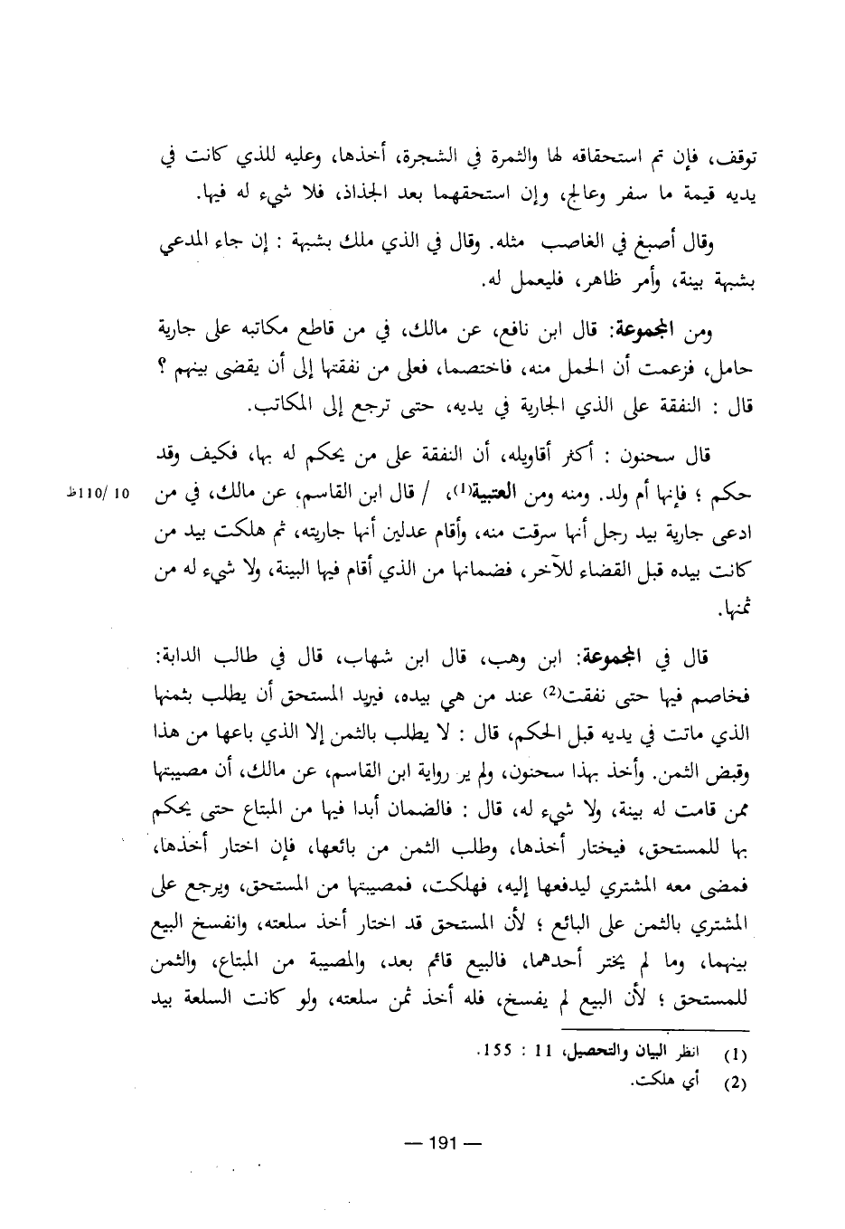 قال سحنون: أكثر أقاويله، أن النفقة على من يحكم له بها، فكيف وقد حكم؛ فإنها أم ولد. ومنه ومن العتبية، / قال ابن القاسم، عن مالك، في من ادعى جارية بيد رجل أنها سرقت منه، وأقام عدلين أنها جاريته، ثم هلكت بيد من كانت بيده قبل القضاء للآخر، فضمانها من الذي أقام فيها البينة، ولا شيء له من ثمنها.