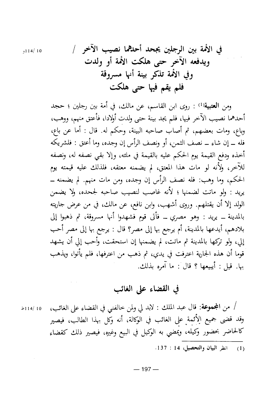 ومن العتبية: روى ابن القاسم، عن مالك، في أمة بين رجلين؛ جحد أحدهما نصيب الآخر فيها، فلم يجد بينة حتى ولدت أولادا، فأعتق منهم، ووهب، وباع، ومات بعضهم، ثم أصاب صاحبه البينة، وحكم له. قال: أما عن باع، فله – إن شاء- نصف الثمن، أو ونصف الرأس إن وجده، وما أعتق: فلشريكه أخذه ودفع القيمة يوم الحكم عليه بالقيمة في ملئه، وإلا بقي نصفه له، ونصفه للآخر، ولأنه لو مات هذا المعتق، لم يضمن معتقه، فلذلك عليه قيمته يوم الحكم، وما وهب: فله نصف الرأس إن وجده، ومن مات منهم. لم يضمنه- يريد: ولو ماتت لضمنها؛ لأنه غاصب لنصيب صاحبه لجحده، ولا يضمن الولد إلا أن يقتلهم. وروى أشهب، وابن نافع، عن مالك، في من عرض جاريته بالمدينة – يريد: وهو مصري- فأتى قوم فشهدوا أنها مسروقة، ثم ذهبوا إلى بلادهم، أيدعها بالمدينة، أم يرجع بها إلى مصر؟ قال: يرجع بها إلى مصر أحب إلي، ولو تركها بالمدينة ثم ماتت، لم يضمنها إن استحقت، وأحب إلي أن يشهد قوما أن هذه الجارية اعترفت في يدي، ثم ذهب من اعترفها، فلم يأتوا، ويذهب بها. قيل: أيبيعها؟ قال: ما آمره بذلك.