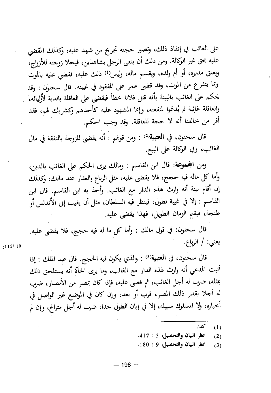 ومن المجموعة: قال ابن القاسم: ومالك يرى الحكم على الغائب بالدين، وأما كل ماله فيه حجج، فلا يقضي عليه، مثل الرباع والعقار عند مالك، وكذلك إن أقام بينة أنه وارث هذه الدار مع الغائب. وأخذ به ابن القاسم. قال ابن القاسم: إلا في غيبة تطول، فينظر فيه السلطان، مثل أن يغيب إلى الاندلس أو طنجة، فيقيم الزمان الطويل، فهذا يقضي عليه.