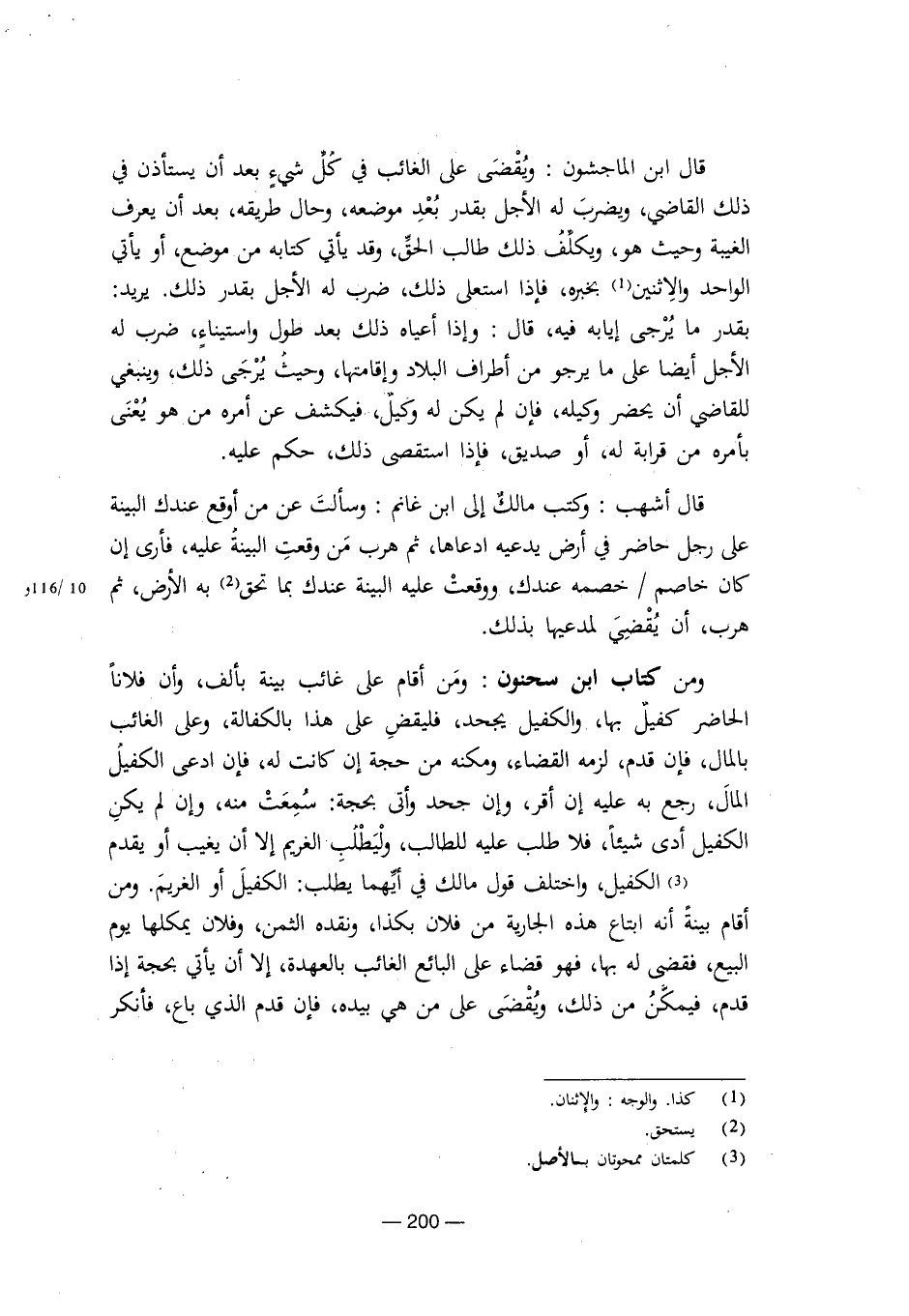 ومن كتاب ابن سحنون: ومن أقام على غائب بينة بألف، وأن فلانا الحاضر كفيل بها، والكفيل يجحد، فليقض على هذا بالكفالة، وعلى الغائب بالمال، فإن قدم، لزمه القضاء، ومكنه من حجة إن كانت له، فإن ادعى الكفيل المال، رجع به عليه إن أقر، وإن جحد وأتى بحجة: سمعت منه، وإن لم يكن الكفيل أدى شيئا، فلا طلب عليه للطالب، وليطلب الغريم إلا أن يغيب أو يقدم الكفيل، واختلف قول مالك في أيهما يطلب: الكفيل أو الغريم. ومن أقام بينة أنه ابتاع هذه الجارية من فلان بكذا، ونقده الثمن، وفلان يملكها يوم البيع، فقضى له بها، فهو قضاء على البائع الغائب بالعهدة، إلا أن يأتي بحجة إذا قدم، فيمكن من ذلك، ويقضى على من هي بيده، فإن قدم الذي باع، فأنكر [8/ 200]
