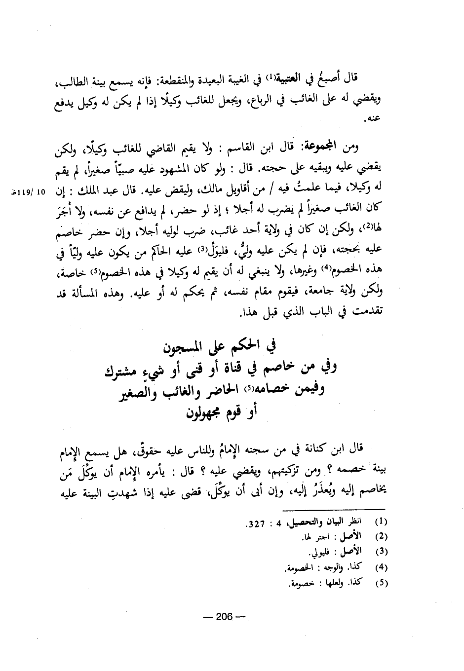 قال ابن كنانة في سجنه الإمام وللناس عليه حقوق، هل يسمع الإمام بينة خصمه؟ ومن تزكيتهم، ويقضي عليه؟ قال: يأمره الإمام أن يوكل من يخاصم إليه ويعذر إليه، وإن أبى أن يوكل، قضى عليه إذا شهدت البينة عليه [8/ 206]