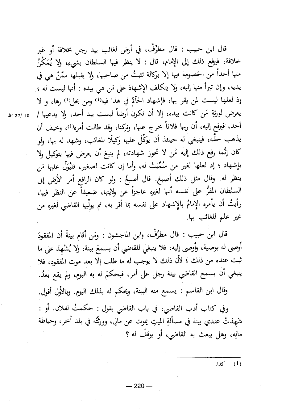 وقال ابن القاسم: يسمع منه البينة، ويحكم له بذلك اليوم. وبالأول أقول. وفي كتاب أدب القاضي، في باب القاضي يقول: حكمت لفلان. أو: شهدت عندي بينة في مسألة الميت يموت عن مال، وورثته في بلد آخر، وحياطة ماله، وهل يبعث به القاضي، أو يوقف له؟ [8/ 220]