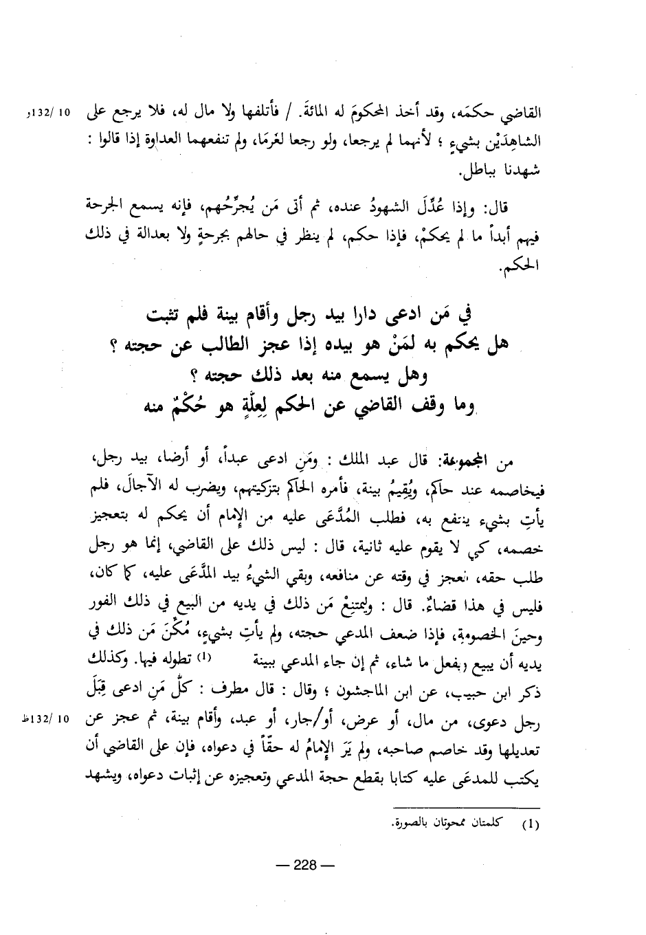 من المجموعة: قال عبد الملك: ومن ادعى عبدا، أو أرضا، بيد رجل، فيخاصمه عند حاكم، ويقيم بينة، فأمره الحاكم بتزكيتهم، ويضرب له الآجال، فلم يأت بشيء ينتفع به، فطلب المدعى عليه من الإمام أن يحكم له بتعجيز خصمه، كي لا يقوم عليه ثانية، قال: ليس ذلك على القاضي، إنم هو رجل طلب حقه، لعجز في وقته عن منافعه، وبقي الشيء بيد المدعى عليه، كما كان، فليس في هذا قضاء. قال: وليمتنع من ذلك في يديه من البيع في ذلك الفور وحين الخصومة، فإذا ضعف المدعى حجته، ولم يأت بشيء، مكن من ذلك في يديه أن يبيع ويفعل ما شاء، ثم إن جاء المدعى ببينة تطوله فيها. وكذلك ذكر أن حبيب، عن ابن الماجشون؛ وقال: قال مطرف: كل من ادعى قبل رجل دعوى، من مال، أو عرض، أو/جار، أو عبد، وأقام بينة، ثم عجز عن تعديلها وقد خاصم صاحبه، ولم ير الإمام له حقا في دعواه، فإن على القاضي أن يكتب للمدعى عليه كتابا بقطع حجة المدعي وتعجيزه عن اثبات دعواه، ويشهد [8/ 228]