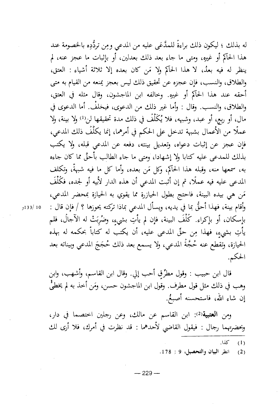 له بذلك؛ ليكون ذلك براءة للمدعى عليه من المدعى ومن تردده بالخصومة عند هذا الحاكم أو غيره، ومتى ما جاء بعد ذلك بعدلين، أو بإثبات ما عجز عنه، لم ينظر له فيه بعد، لا هذا الحاكم ولا من كان بعده إلا ثلاثا أشياء: العتق، والطلاق، والنسب، فإن عجزه عن تحقيق ذلك ليس بعجز يمنعه من القيام به متى أحقه عند هذا الحاكم أو غيره. وخالفه ابن الماجشون، وقال مثله في العتق، والطلاق، والنسب. وقاله: وأما غير ذلك من الدعوى، فيخلف. أما الدعوى في مال، أو ربع، أو عبد، وشبهه، فلا يكلف في ذلك مدة تحقيقها لن ولا بينة، ولا عملا من الأعمال بشبهة تدخل على الحكم في أمرهما، إنما يكلف ذلك المدعي، فإن عجز عن إثبات دعواه، وتعديل بينته، دفعه عن المدعي قبله، ولا يكتب بذلك للمدعى عليه كتابا ولا إشهادا، ومتى ما جاء الطالب بأحق مما كان جاءه به، سمعهما منه، وقبله هذا الحاكم، وكل من بعده، وأما كل ما فيه شبهة، وتكلف المدعى عليه فيه عملا، ثم إن اثبت المدعي أن هذه الدار لأبيه أو لجده، فكلف من هي بيده البينة، فاحتج بطول الحيازرة مما يقوي به الحيازة بمحضر المدعي، وأقام بينة، فهذا أحق بما في يديه، ويسأل المدعي بماذا تركته يحوزها؟ / فإن قال: بإسكان، أو بإكراء. كلف البينة، فإن لم يأت بشيء، وضربت له الآجال، فلم يأت بشيء، فهذا من حق المدعى عليه، أن يكتب له كتابا بحكمه له بهذه الحيازة، وتقطع عنه حجة المدعي، ولا يسمع بعد ذلك حجج المدعى وبيناته بعد الحكم.