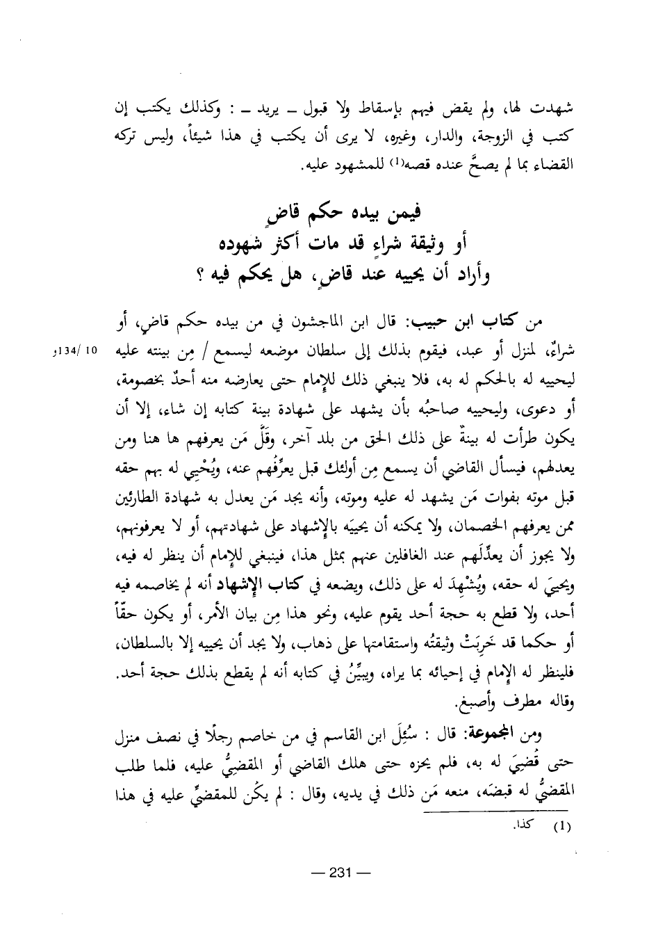 من كتاب ابن حبيب: قال ابن الماجشون في من بيده حكم قاض، أو شراء، لمنزل أو عبد، فيقوم بذلك إلى سلطان موضعه ليسمع/ من بينته عليه ليحييه له بالحكم له به، فلا ينبغي ذلك للإمام حتى يعارضه منه أحد بخصومة، أو دعوى، وليحييه صاحبه بأن يشهد على شهادة بينة كتابه إن شاء، إلا أن يكون طرأت له بينة على ذلك الحق من بلد آخر، وقل من يعرفهم ها هنا ومن يعدلهم، فيسأل القاضي أن يسمع من أولئك قبل يعرفهم عنه، ويحيي له بهم حقه قبل موته بفوات من يشهد له عليه وموته، وأنه يجد من يعدل به شهادة الطارئين ممن يعرهم الخصمان، ولا يمكنه أن يحييه بالإشهاد على شهادتهم، أو لا يعرفونهم، ولا يجو أن يعدلهم عند الغافلين عنهم بمثل هذا، فينبغي للإمام أن ينظر له فيه، ويحيي له حقه، ويشهد له على ذلك، ويضعه في كتاب الإشهاد أنه لم يخاصمه فيه أحد، ولا قطع به حجة أحد يقوم عليه، ونحو هذا من بيان الأمر، أو يكون حقا أو حكما قد خربت وثيقته واستقامتها على ذهاب، ولا يجد أن يحييه إلا بالسلطان، فلينظر له الإمام في إحيائه بما يراه، ويبين في كتابه أنه لم يقطع بذلك حجة أحد. وقال مطرف وأصبغ.