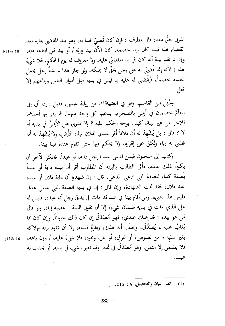 وسئل ابن القاسم، وهو في العتبية، من رواية عيسى، فقيل: إذا أتى إلى الحاكم خصمان في أرض بالصحراء، يدعيها كل واحد منهما، ثم يقر بها أحدهما للآخر من غير بينة، كيف يوجه الحكم عليه؟ ولا يدري هل الأرض في يديه أم لا؟ قال: بل يشهد له أن فلانا أقر عندي لفلان بهذه الأرض، ولا يشهد له أنه قضى له بها، ولكن على إقراره، ولا يحكم فيها حتى تقوم عنده فيها بينة.