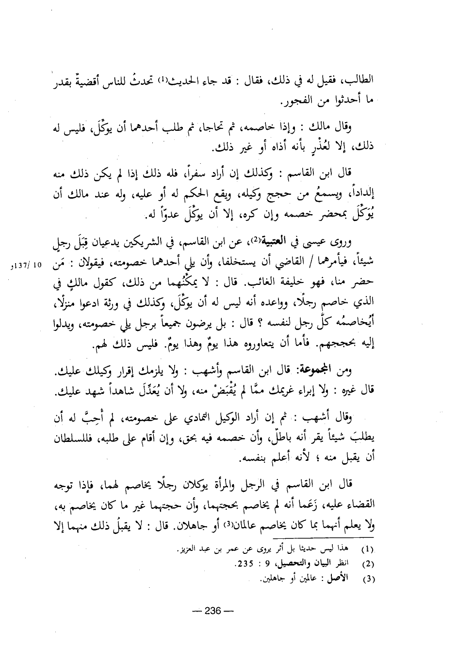 قال ابن القاسم في الرجل والمرأة يوكلان رجلا يخاصم لهما، فإذا توجه القضاء عليه، زعما أنه لم يخاصم بحجتهما، وأن حجتهما غير ما كان يخاصم به، ولا يعلم أنهما بما كان يخاصم عالمان أو جاهلان. قال: لا يقبل ذلك منهما إلا [8/ 236]