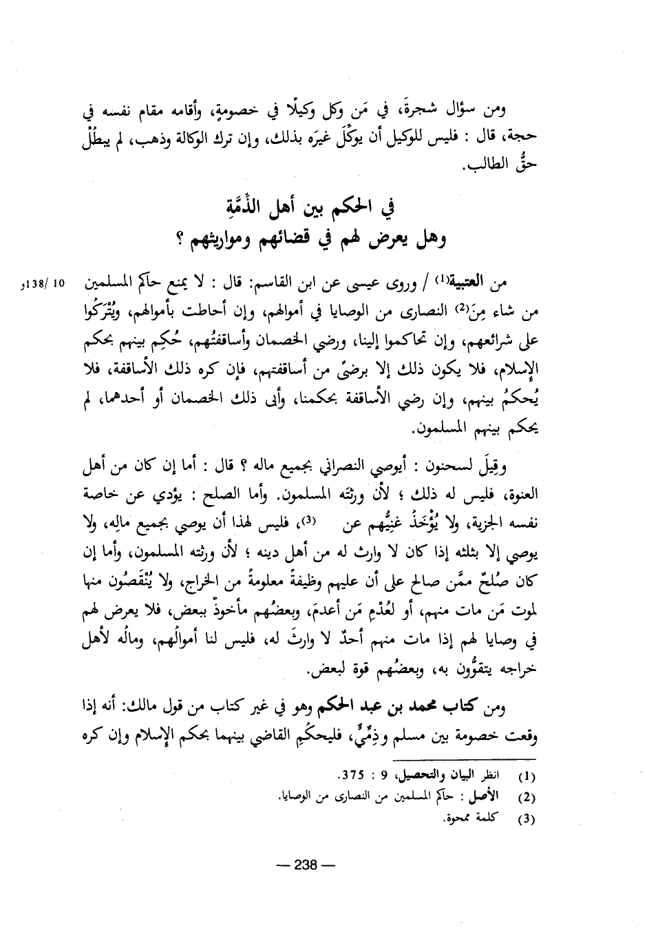 من العتبية/ وروى عيسى عن ابن القاسم: قال: لا يمنع حاكم المسلمين من شاء من النصارى من الوصايا في أموالهم، وإن أحاطت بأموالهم، ويتركوا على شرائعهم، وإن تحاكموا إلينا، ورضي الخصمان وأساقفتهم، حكم بينهم بحكم الإسلام، فلا يكون ذلك إلا برضى من أساقفتهم، فإن كره ذلك الأساقفة، فلا يحكم بينهم، وإن رضي الأساقفة بحكمنا، وأبى ذلك الخصمان أو أحدهما، لم يحكم بينهم المسلمون.