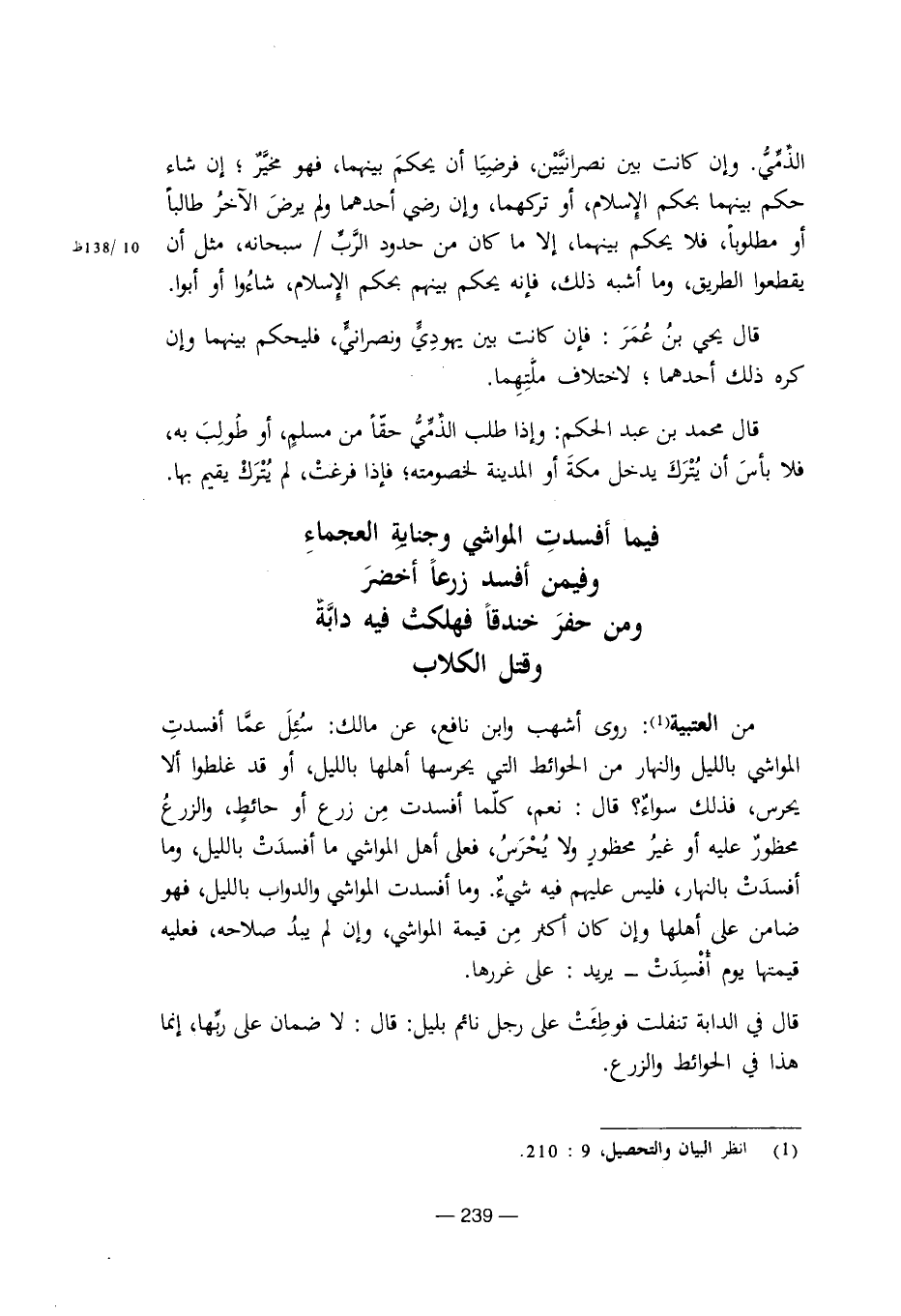 من العتبية: روى أشهب وابن نافع، عن مالك: سئل عما أفسدت المواشي بالليل والنهار من الحوائط التي يحرسها أهلها بالليل، أو قد غلطوا ألا يحرس، فذلك سواء؟ قال: نعم، كلما أفسدت من زرع أو حائط، والزرع محظور عليه أو غير محظور ولا يحرس، فعلى أهل المواشي ما أفسدت بالليل، وما أفسدت بالنهار، فليس عليهم فيه شيء. وما أفسدت المواشي والدواب بالليل، فهو ضامن على أهلها وإن كان أكثر من قيمة المواشي، وإن لم يبد صلاحه، فعليه قيمتها يوم أفسدت – يريد: على غررها.