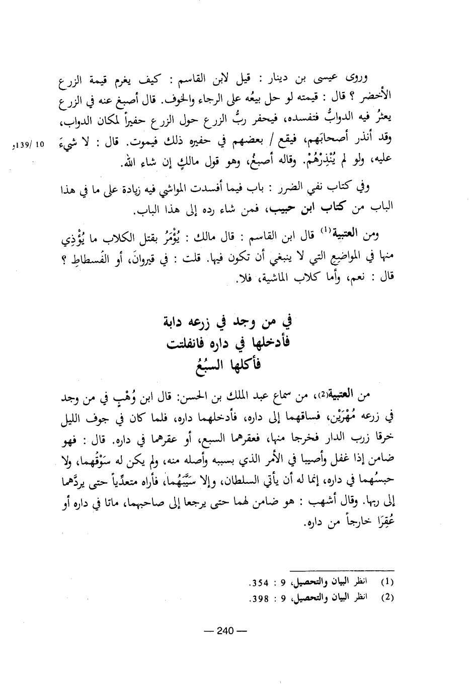وفي كتاب نفي الضرر: باب فيما أفسدت المواشي فيه زيادة على ما في هذا الباب من كتاب ابن حبيب، فمن شاء رده إلى هذا الباب.