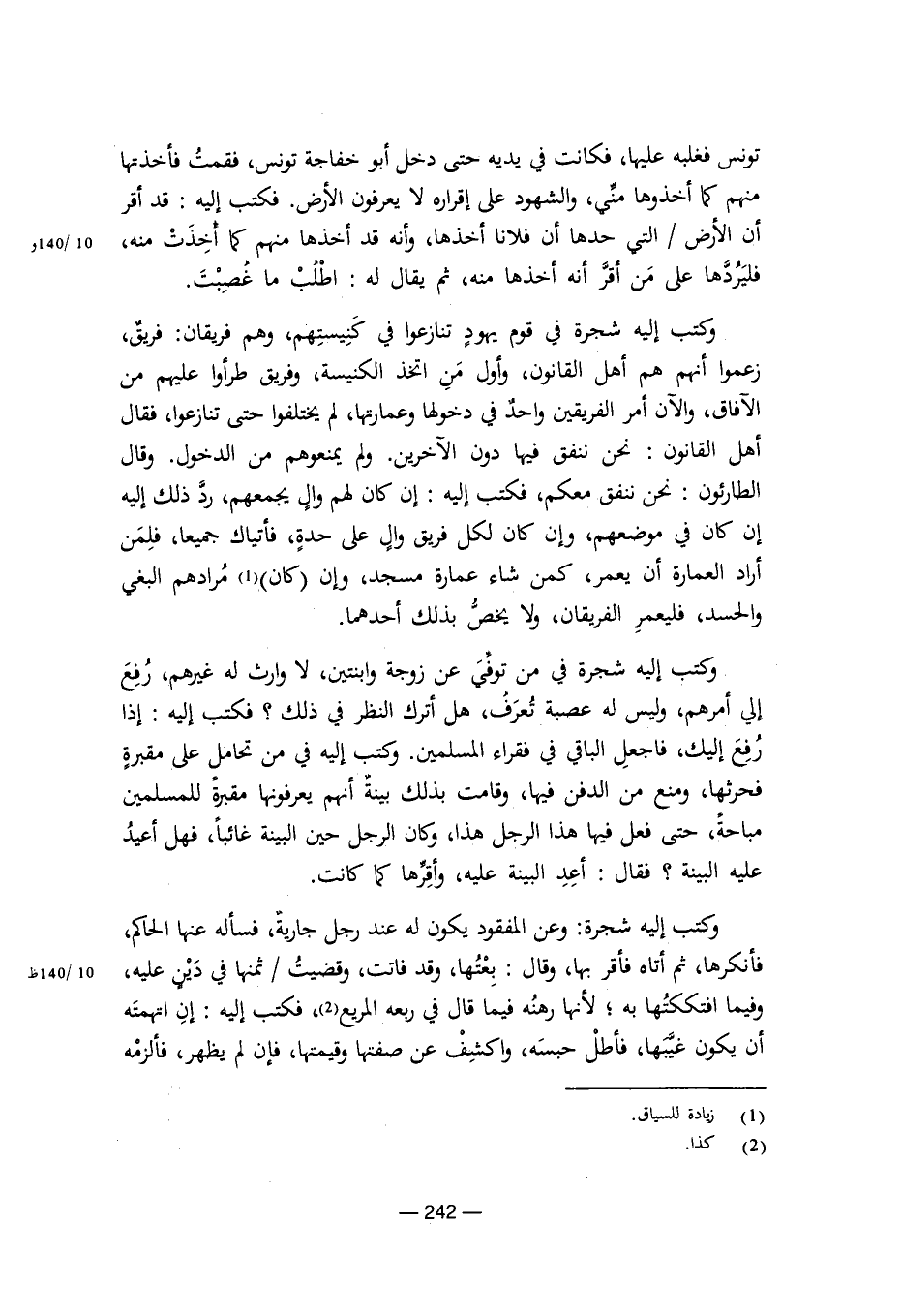 وكتب إليه شجرة في قوم يهود تنازعوا في كنيستهم، وهم فريقان: فريق، زعموا أنهم هم أهل القانون، وأول من اتخذ الكنيسة، وفريق طرأوا عليهم من الآفاق، والآن أمر الفريقين واحد في دخولها وعمارتها، لم يختلفوا حتى تنازعوا، فقال أهل القانون: نحن ننفق معكم، فكتب إليه: إن كان لهم وال يجمعهم، رد ذلك إليه إن كان في موضعهم، وإن كان لكل فريق وال على حدة، فأتياك جميعا، فلمن أراد العمارة أن يعمر، كمن شاء عمارة مسجد، وإن كان مرادهم البغي والحسد، فليعمر الفريقان، ولا يخص بذلك أحدهما.