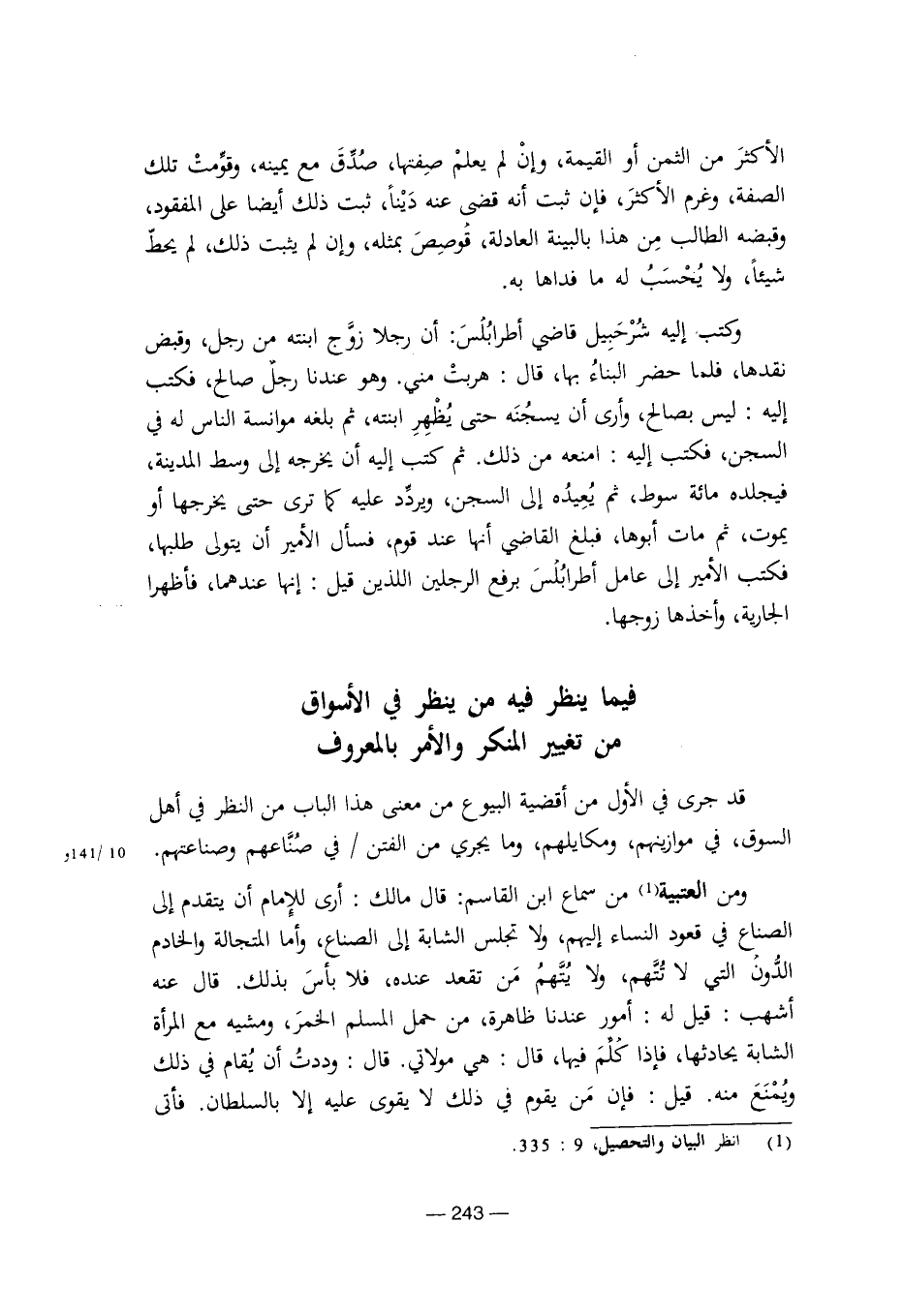 ومن العتبية من سماع ابن القاسم: قال مالك: أرى للإمام أن يتقدم إلى الصناع في قعود النساء إليهم، ولا تجلس الشابة إلى الصناع، وأما المتجالة الخادم الدون التي لا تتهم، ولا يتهم من تقعد عنده، فلا بأس بذلك. قال عنه أشهب: قيل له: أمور عندنا ظاهرة، من حمل المسلم الخمر، ومشيه مع المرأة الشابة يحادثها، فإذا كلم فيها، قال: هي مولاتي. قال: وددت أن يقام في ذلك ويمنع منه. قيل: فإن من يقوم في ذلك لا يقوى عليه إلا بالسلطان. فأتى [8/ 243]