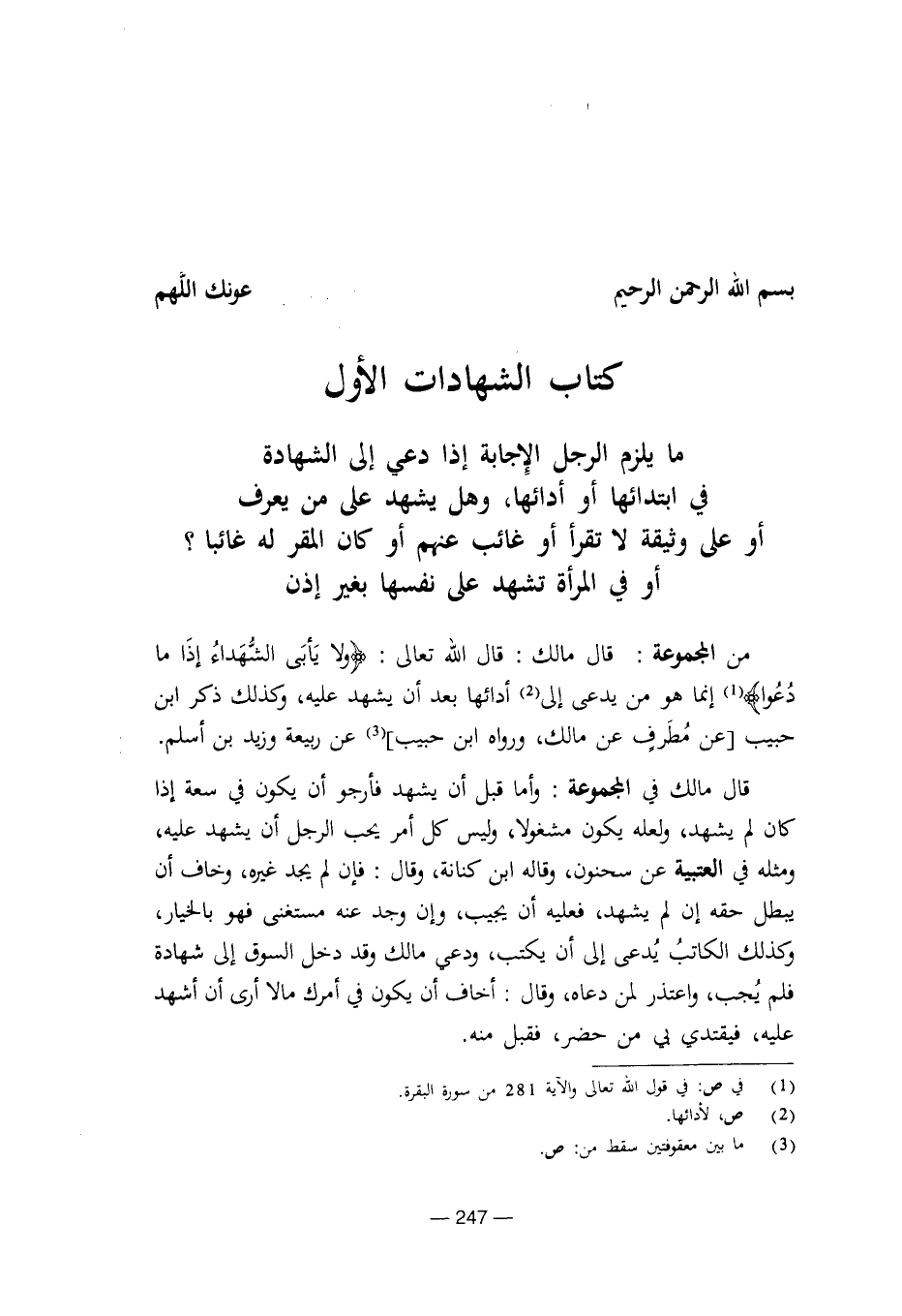 من المجموعة: قال مالك: قال الله تعالى: (ولا يأبى الشهداء إذا ما دعوا) إنما هو من يدعي إلى أدائها بعد أن يشهد عليه، وكذلك ذكر ابن حبيب [عن مطرف عن مالك، ورواه ابن حبيب] عن ربيعة وزيد بن أسلم.