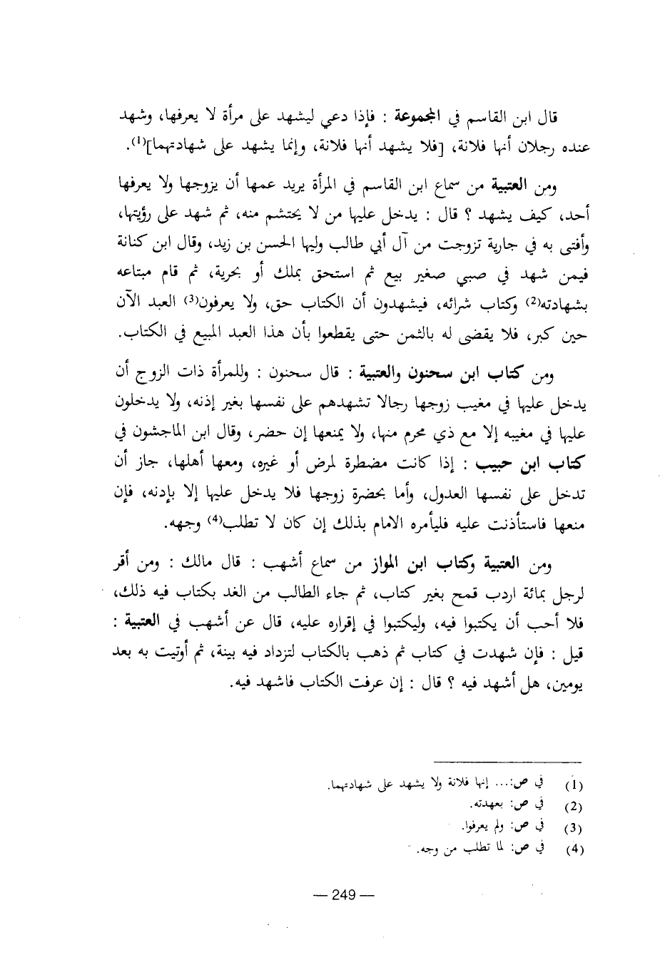 ومن كتاب ابن سحنون والعتبية: قال سحنون: وللمرأة ذات الزوج أن يدخل عليها في مغيب زوجها رجالا تشهدهم على نفسها بغير إذنه، ولا يدخلون عليها في مغيبه إلا مع ذي محرم منها، ولا يمنعها إن حضر، وقال ابن الماجشون في كتاب ابن حبيب: إذا كانت مضطرة لمرض أو غيره، ومعها أهلها، جاز أن تدخل على نفسها العدول، وأما بحضرة زوجها فلا يدخل عليها إلا بإذنه، فإن منعها فاستأذنت عليه فليأمره الامام بذلك أن كان لا تطلب وجهه.