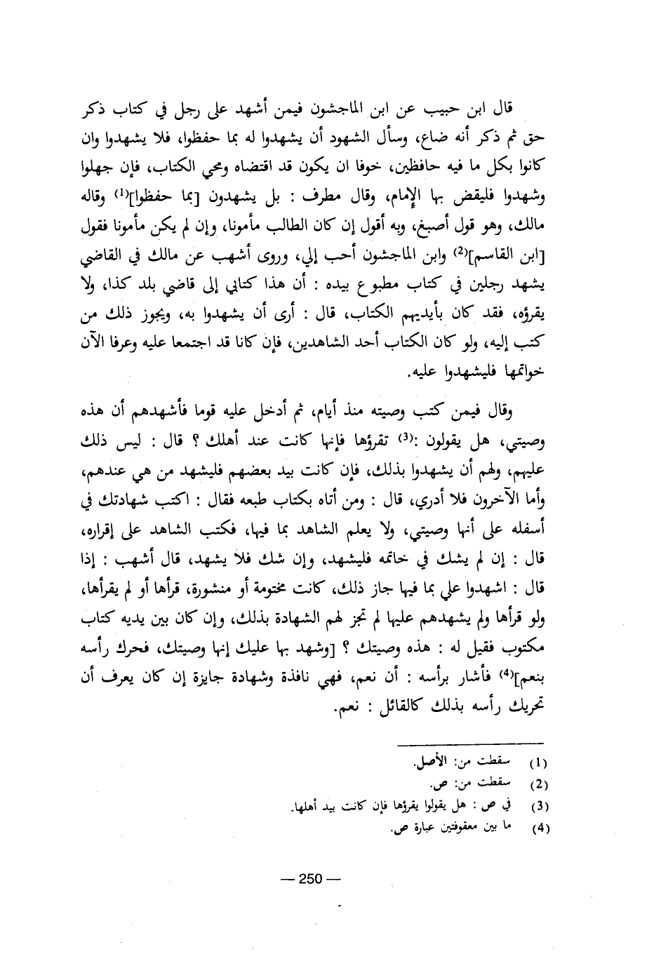 وقال فيمن كتب وصيته منذ أيام، ثم أدخل عليه قوما فأشهدهم أن هذه وصيتي، هل يقولون: تقرؤها فإنها كانت عند أهلك؟ قال: ليس ذلك عليهم، ولهم أن يشهدوا بذلك، فإن كانت بيد بعضهم فليشهد من هي عندهم، وأما الآخرون فلا أدري، قال: ومن أتاه بكتاب طبعه فقال: اكتب شهادتك في أسفله على أنها وصيتي، ولا يعلم الشاهد بما فيها، فكتب الشاهد على إقراره، قال: إن لم يشك في خاتمه فليشهد، وإن شك فلا يشهد، قال أشهب: إذا قال: اشهدوا علي بما فيها جاز ذلك، كانت مختومة أو منشورة، قرأها أو لم يقرأها، ولو قرأها ولم يشهدهم عليها لم تجز لهم الشهادة بذلك، وإن كان بين يديه كتاب مكتوب فقيل له: هذه وصيتك؟ [وشهد بها عليك إنها وصيتك، فحرك رأسه بنعم] فأشار برأسه: أن نعم، فهي نافذة وشهادة جايزة إن كان يعرف أن تحريك رأسه بذلك كالقائل: نعم. [8/ 250]