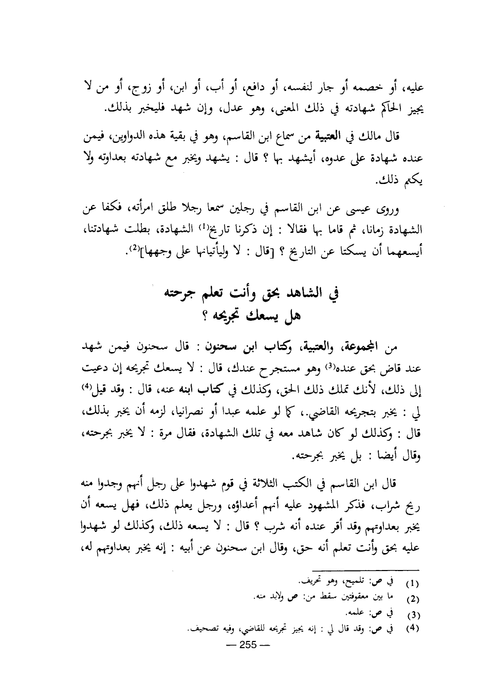 من المجموعة، والعتبية، وكتاب ابن سحنون: قال سحنون فيمن شهد عند قاض بحق عنده وهو مستجرح عندك، قال: لا يسعك تجريحه إن دعيت إلى ذلك، لأنك تملك ذلك الحق، وكذلك في كتاب ابنه عنه، قال: وقد قيل لي: يخبر بتجريحه القاضي.، كما لو علمه عبدا أو نصرانيا، لزمه أن يخبر بذلك، قال: وكذلك لو كان شاهد معه في تلك الشهادة، فقال مرة: لا يخبر بجرحته، وقال أيضا: بل يخبر بجرحته.