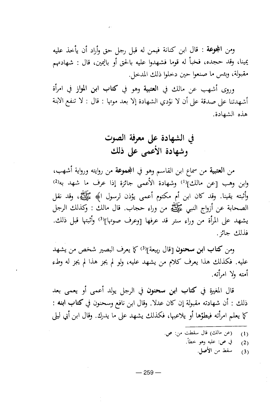 من العتبية من سماع ابن القاسم وهو في المجموعة من روايته ورواية أشهب، وابن وهب [عن مالك] وشهادة الأعمى جائزة إذا عرف ما شهد به وأثبته يقينا. وقد كان ابن أم مكتوم أعمى يؤذن لرسول) صلى الله عليه وسلم، وقد نقل الصحابة عن أزواج النبي صلى الله عليه وسلم، من وراء حجاب. قال مالك: وكذلك الرجل يشهد على المرأة من وراء ستر قد عرفها [وعرف صوتها] وأثبتها قبل ذلك. فذلك جائز.