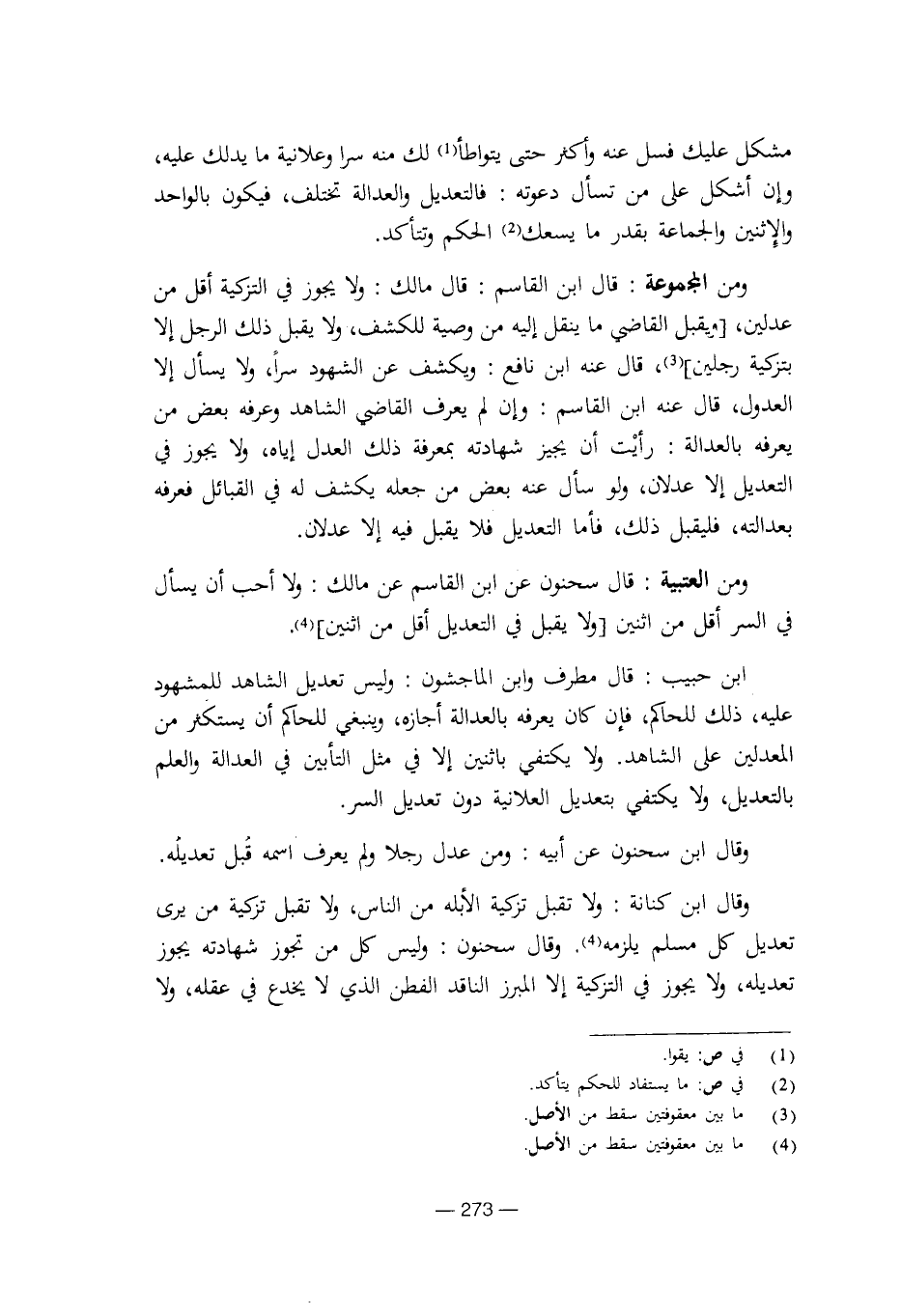 ومن العتبية: قال سحنون عن ابن القاسم عن مالك: ولا أحب أن يسأل في السر أقل من اثنين [ولا يقبل في التعديل أقل من اثنين].