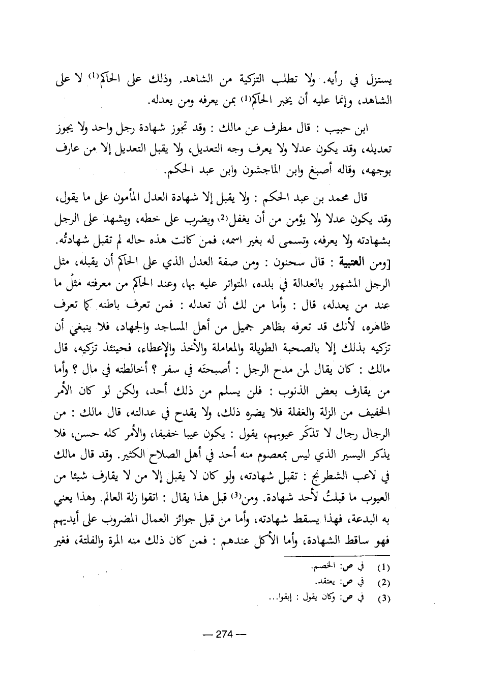 قال محمد بن عبد الحكم: ولا يقبل إلا شهادة العدل المأمون على ما يقول، وقد يكون عدلا ولا يؤمن من أن يغفل ويضرب على خطه، ويشهد على الرجل بشهادته ولا يعرفه، وتسمى له بغير اسمه، فمن كانت هذه حاله لم تقبل شهادته. [ومن العتبية: قال سحنون: ومن صفة العدل الذي على الحاكم أن يقبله، مثل الرجل المشهور بالعدالة في بلده، المتواتر عليه بها، وعند الحاكم من معرفته مثل ما عند من يعدله، قال: وأما من لك أن تعدله: فمن تعرف باطنه كما تعرف ظاهره، لأنك قد تعرفه بظاهر جميل من أهل المساجد والجهاد، فلا ينبغي أن تزكيه بذلك إلا بالصحبة الطويلة والمعاملة والأخذ والإعطاء، فحينئذ تزكيه، قال مالك: كان يقال لمن مدح الرجل: أصبحته في سفر؟ أخالطته في مال؟ وأما من يقارف بعض الذنوب: فلن يسلم من ذلك أحد، ولكن لو كان الأمر الخفيف من الزلة والغفلة فلا يضره ذلك، ولا يقدح في عدالته، قال مالك: من الرجال رجال لا تذكر عيوبهم، يقول: يكون عيبا خفيفا، والأمر كله حسن، فلا يذكر اليسير الذي ليس بمعصوم منه أحد في أهل الصلاح الكثير. وقد قال مالك في لاعب الشطرنج: تقبل شهادته، ولو كان لا يقبل إلا من لا يقارف شيئا من العيوب ما قبلت لأحد من شهادة. ومن قبل هذا يقال: اتقوا زلة العالم. وهذا يعني به البدعة، فهذا يسقط شهادته، وأما من قبل جوائز العمال المضروب على أيديهم فهو ساقط الشهادة، وأما الأكل عندهم: فمن كان ذلك منه المرة والفلتة، فغير] [8/ 274]