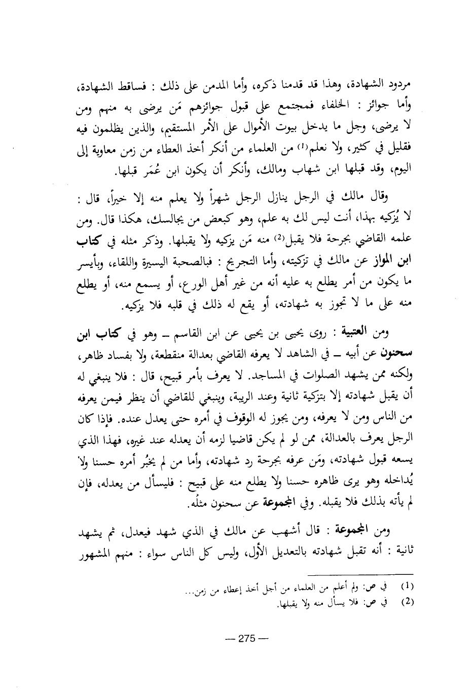 ومن العتبية: روى يحيى بن يحيى عن ابن القاسم – وهو في كتاب ابن سحنون عن أبيه – في الشاهد لا يعرفه القاضي بعدالة منقطعة، ولا بفساد ظاهر، ولكنه ممن يشهد الصلوات في المساجد. لا يعرف بأمر قبيح، قال: فلا ينبغي له أن يقبل شهادته إلا بتزكية ثانية وعند الربية، وينبغي للقاضي أن ينظر فيمن يعرفه من الناس ومن لا يعرفه، ومن يجوز له الوقوف في أمره حتى يعدل عنده. فإذا كان الرجل يعرف بالعدالة، ممن لو لم يكن قاضيا لزمه أن يعدله عند غيره، فهذا الذي يسعه قبول شهادته، ومن عرفه يجرحه رد شهادته، وأما من لم يخبر أمره حسنا ولا يداخله وهو يرى ظاهره حسنا ولا يطلع منه على قبيح: فليسأل من يعدله، فإن لم يأته بذلك فلا يقبله. وفي المجموعة عن سحنون مثله.