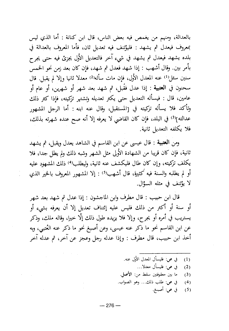 بالعدالة، ومنهم من يغمض فيه بعض الناس، قال ابن كنانة: أما الذي ليس بمعروف فيعدل ثم يشهد: فليؤتنف فيه تعديل ثان، فأما المعروف بالعدالة في بلده يشهد فيعدل ثم يشهد في شيء آخر فالتعديل الأول يجزئ فيه حتى يجرح بأمر بين. وقال أشهب: إذا شهد فعدل ثم شهد، فإن كان بعد زمن نحو الخمس سنين سئل عنه المعدل الأول، فإن مات سأله معدلا ثانيا وإلا لم يقبل. قال سحنون في العتبية: إذا عدل فقبل، ثم شهد بعد شهر أو شهرين، أو عام أو عامين، قال: فيسأله التعديل حتى يكثر تعديله وتشتهر تزكيته، فإذا كثر ذلك وتأكد فلا يسأله تزكيته في [المستقبل، وقال عنه ابنه: أما الرجل المشهور عدالته] في البلد، فإن كان القاضي لا يعرفه إلا أنه صح عنده شهرته بذلك، فلا يكلفه التعديل ثانية.