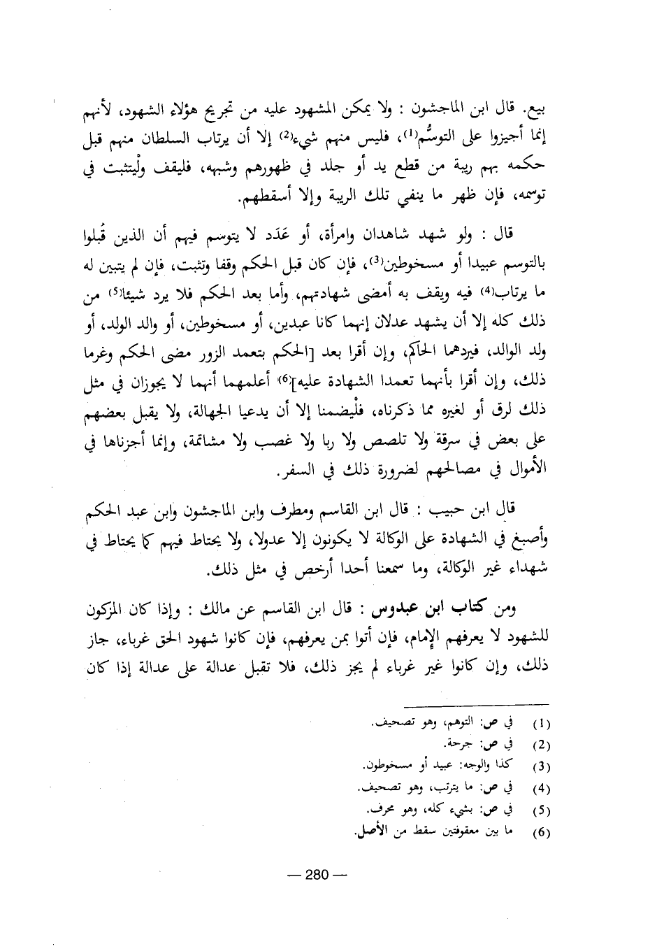 بيع. قال ابن الماجشون: ولا يمكن المشهود عليه من تجريح هؤلاء الشهود، لأنهم إنما أجيزوا على التوسم، فليس منهم شيء إلا أن يرتاب السلطان منهم قبل حكمه بهم ريبة من قطع يد أو جلد في ظهورهم وشبهه، فليقف وليتثبت في توسمه، فإن ظهر ما ينفي تلك الريبة وإلا أسقطهم.