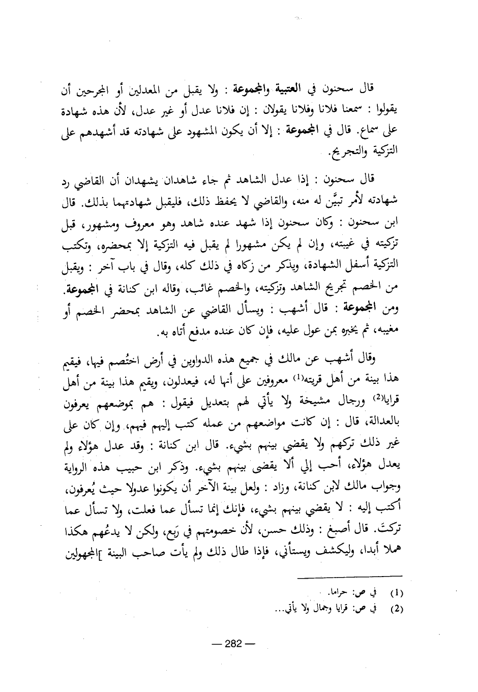 قال سحنون في العتبية والمجموعة: لا يقبل من المعدلين أو المجرحين أن يقولوا: سمعنا فلانا وفلانا يقولان: إن فلانا عدل أو غير عدل، لأن هذه شهادة على سماع. قال في المجموعة: إلا أن يكون المشهود على شهادته قد أشهدهم على التزكية والتجريح.