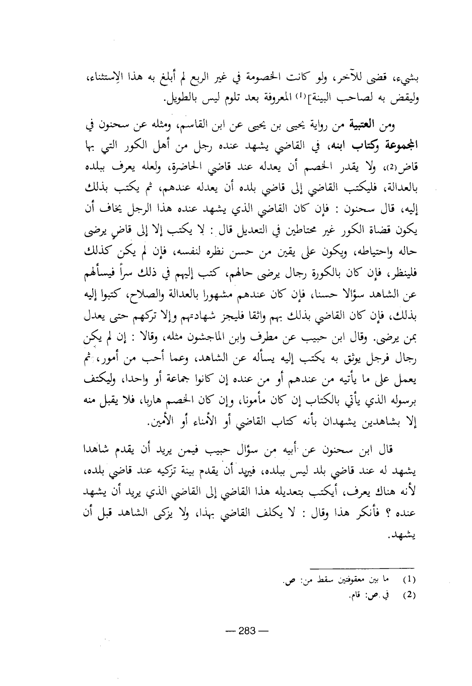 ومن العتبية من رواية يحيى بن يحيى عن ابن القاسم، ومثله عن سحنون في المجموعة وكتاب ابنه، في القاضي يشهد عنده رجل من أهل الكور التي بها قاض، ولا يقدر الخصم أن يعدله عند قاضي الحاضرة، ولعله يعرف ببلده بالعدالة، فليكتب القاضي إلى قاضي بلده أن يعدله عندهم، ثم يكتب بذلك إليه، قال سحنون: فإن كان القاضي الذي يشهد عنده هذا الرجل يخاف أن يكون قضاة الكور غير محتاطين في التعديل قال: لا يكتب إلا إلى قاض يرضى حاله واحتياطه، ويكون على يقين من حسن نظره لنفسه، فإن لم يكن كذلك فلينظر، فإن كان بالكورة رجال يرضى حالهم، كتب إليهم في ذلك سراً فيسألهم عن الشاهد سؤالا حسنا، فإن كان عندهم مشهوراً بالعدالة والصلاح، كتبوا إليه بذلك، فإن كان القاضي بذلك بهم واثقا فليجز شهادتهم وإلا تركهم حتى يعدل بمن يرضى. وقال ابن حبيب عن مطرف وابن الماجشون مثله، وقالا: إن لم يكن رجال فرجل يوثق به يكتب إليه يسأله عن الشاهد، وعما أحب من أمور، ثم يعمل على ما يأتيه من عندهم أو من عنده إن كانوا جماعة أو واحدا، وليكتف برسوله الذي يأتي بالكتاب إن كان مأمونا، وإن كان الخصم هاربا، فلا يقبل منه إلا بشاهدين يشهدان بأنه كتاب القاضي أو الأمناء أو الأمين.