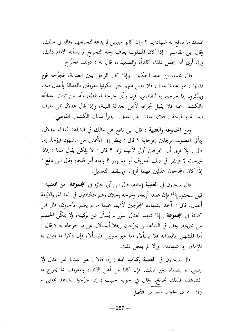 قال سحنون في العتبية [مثله، قال ابن أبي حازم في المجموعة. من العتبية: قيل سحنون] فإن عدله أربعة، وجرحه رجلان وهم متكافئون في العدالة، والأربعة أعدل، قال: آخذ بشهادة المجرجين لأنهما علما ما لم يعلم الآخرون، قال ابن كنانة في المجموعة: إذا شهد العدل المبرز لم يسأل عن تزكيته، ولا يمكن الخصم من تجريحه، وقال في الشاهدين يجرحان رجلا أيسألان عن ما جرحاه به؟ قال: أما المشهور بالعدالة فلا يسألا، أما غير مبرزين فليسألا، فإن ذكروا ما يتبين به للإمام، رد شهادته، وإلا لم يفعل ذلك.