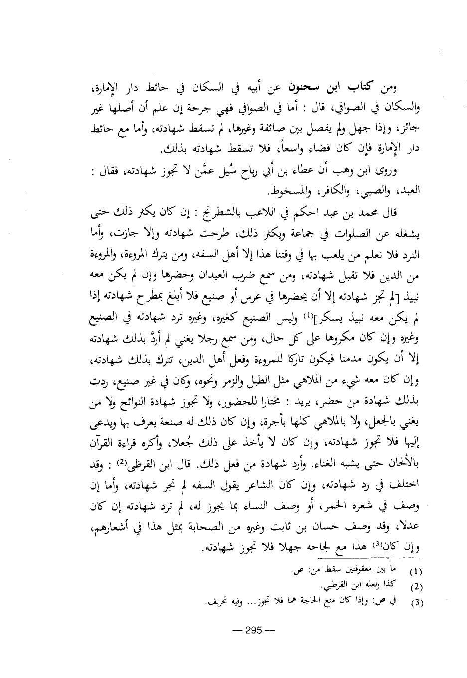 ومن كتاب ابن سحنون عن أبيه في السكان في حائط دار الامارة، والسكان في الصوافي، قال: أما في الصوافي فهي جرحة إن علم أن أصلها غير جائز، وإذا جهل ولم يفصل بين صائفة وغيرها، ولم تسقط شهادته، وأما مع حائط دار الإمارة فإن كان فضاء واسعا، فلا تسقط شهادته بذلك.