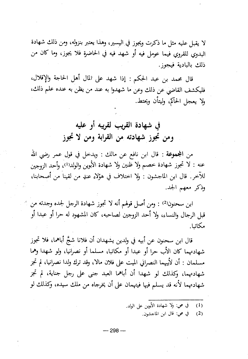 ابن سحنون: ومن أصل قولهم أنه لا تجوز شهادة الرجل لجده وجدته من قبل الرجال والنساء، ولا أحد الزوجين لصاحبه، كان المشهود له حرا أو عبدا أو مكاتبا.