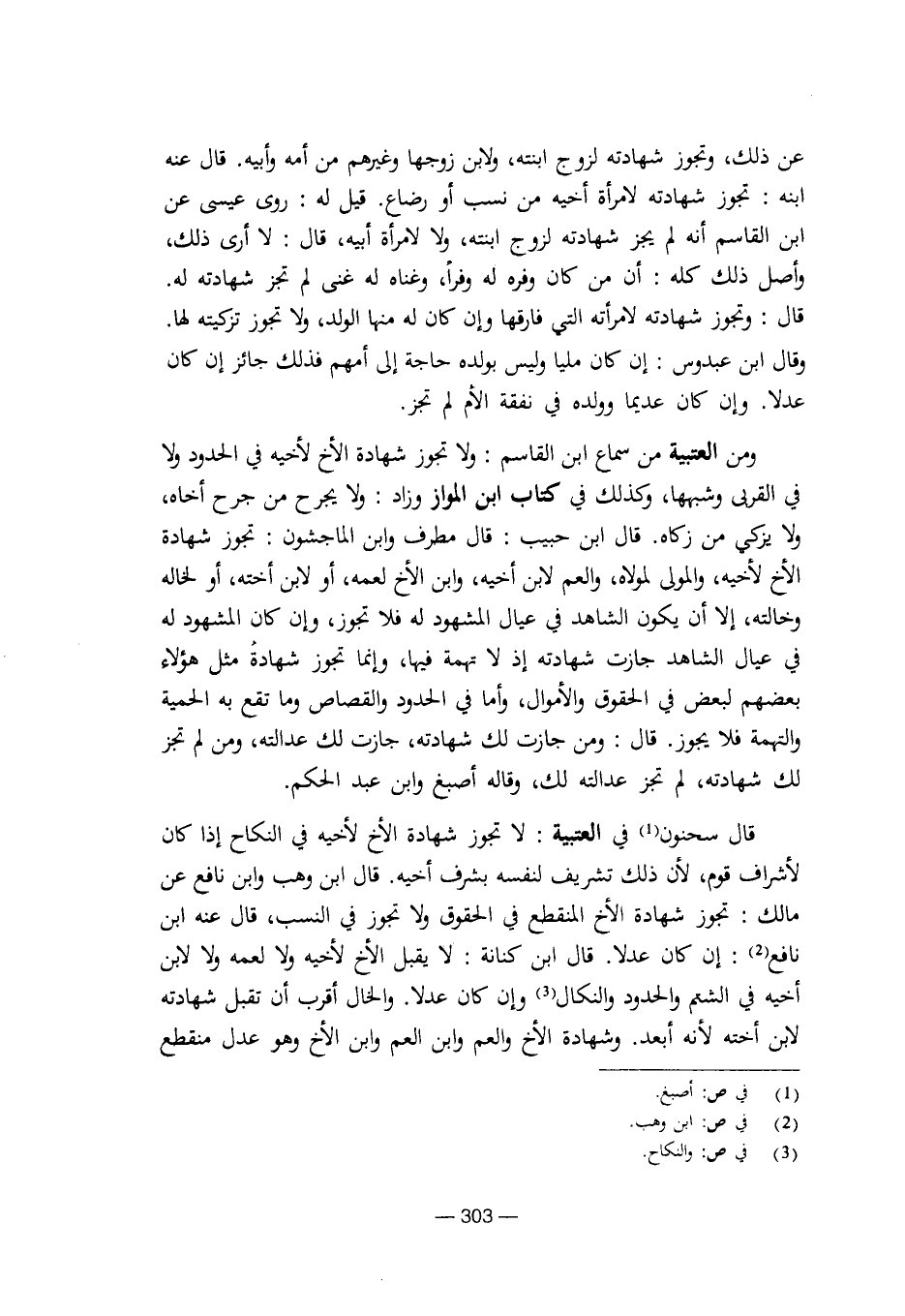 قال سحنون في العتبية: لا تجوز شهادة الأخ لأخيه في النكاح إذا كان لأشراف قوم، لأن ذلك تشريف لنفسه بشرف أخيه. قال ابن وهب وابن نافع عن مالك: تجوز شهادة الأخ المنقطع في الحقوق ولا تجوز في النسب، قال عنه ابن نافع: إن كان عدلا. قال ابن كنانة: لا يقبل الأخ لأخيه ولا لعمه ولا لابن أخيه في الشتم والحدود والنكال وإن كان عدلا. والخال أقرب أن تقبل شهادته لابن أخته لأنه أبعد. وشهادة الأخ والعم وابن العم وابن الأخ وهو عدل منقطع [8/ 303]