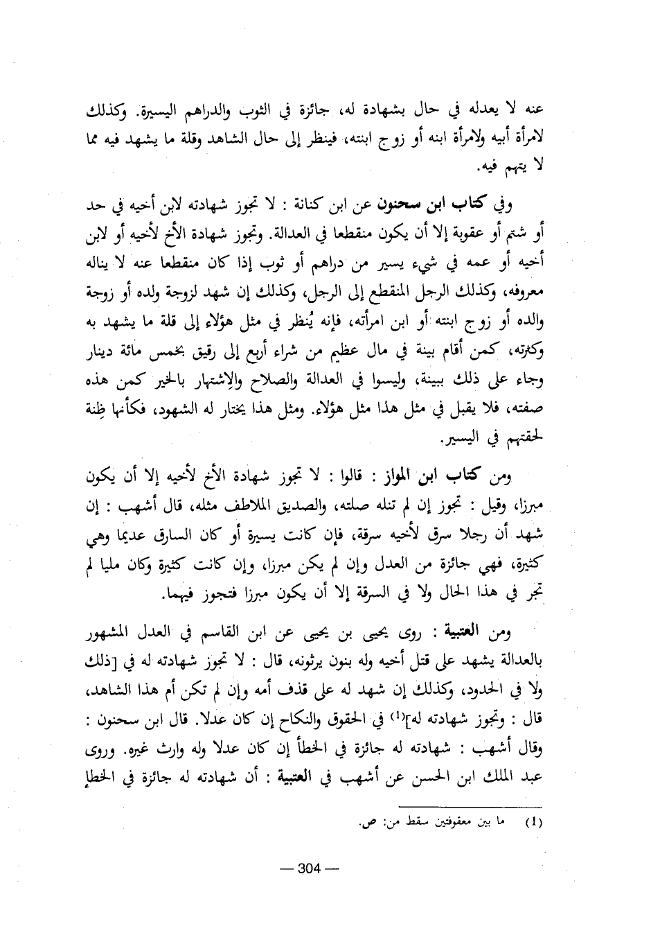وفي كتاب ابن سحنون عن ابن كنانة: لا تجوز شهادته لابن أخيه في حد أو شتم أو عقوبة إلا أن يكون منقطعا في العدالة. وتجوز شهادة الأخ لأخيه أو لابن أخيه أو عمه في شيء يسير من دراهم أو ثوب إذا كان منقطعا عنه لا يناله معروفه، وكذلك الرجل المنقطع إلي الرجل، وكذلك إن شهد لزوجة ولده أو زوجة والده أو زوج ابنته أو ابن امرأته، فإنه ينظر في مثل هؤلاء إلى قلة ما يشهد به وكثرته، كمن أقام بينة في مال عظيم من شراء أربع إلى رقيق بخمس مائة دينار وجاء على ذلك ببينة، وليسوا في العدالة والصلاح والإشتهار بالخير كمن هذه صفته، فلا يقبل في مثل هؤلاء. ومثل هذا يختار له الشهود، فكأنها ظنة لحقتهم في اليسير.