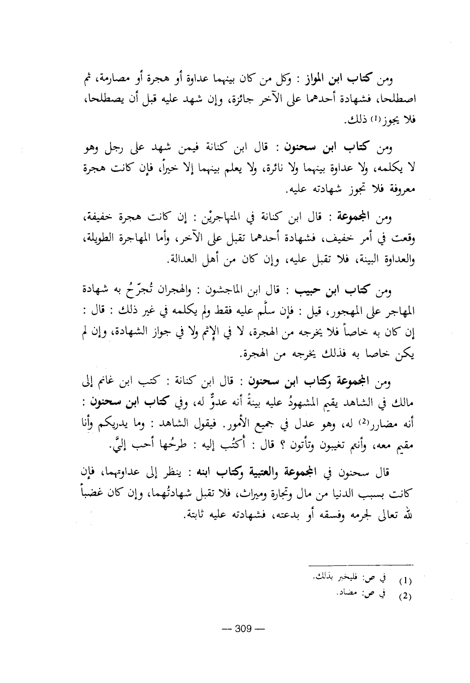 ومن المجموعة: قال ابن كنانة في المتهاجرين: إن كانت هجرة خفيفة، وقعت في أمر خفيف، فشهادة أحدهما تقبل على الآخر، وأما المهاجرة الطويلة، والعداوة البينة، فلا تقبل عليه، وإن كان من أهل العدالة.